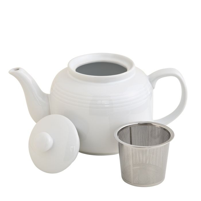The House of Prill white teapot with a stainless steel infuser brews and serves loose leaf tea with elegance and ease. Made from fine porcelain and paired with an 18/8 stainless steel infuser, this 32-ounce teapot retains heat to steep flavorful tea and keep it warm longer. The lid locks securely to the infuser, allowing for one-handed serving and easy removal after brewing. The ergonomic handle ensures a comfortable grip, while the drip-free spout makes for mess-free pouring. The infuser's micro-perforations allow leaves to fully circulate and infuse maximum aroma and flavor without metallic aftertaste. A built-in lift tab lets the infuser be removed safely without burning fingers. Lead- and cadmium-free, the teapot and lid are microwave safe but not intended for direct flame contact. Dishwasher safe for convenient cleanup.