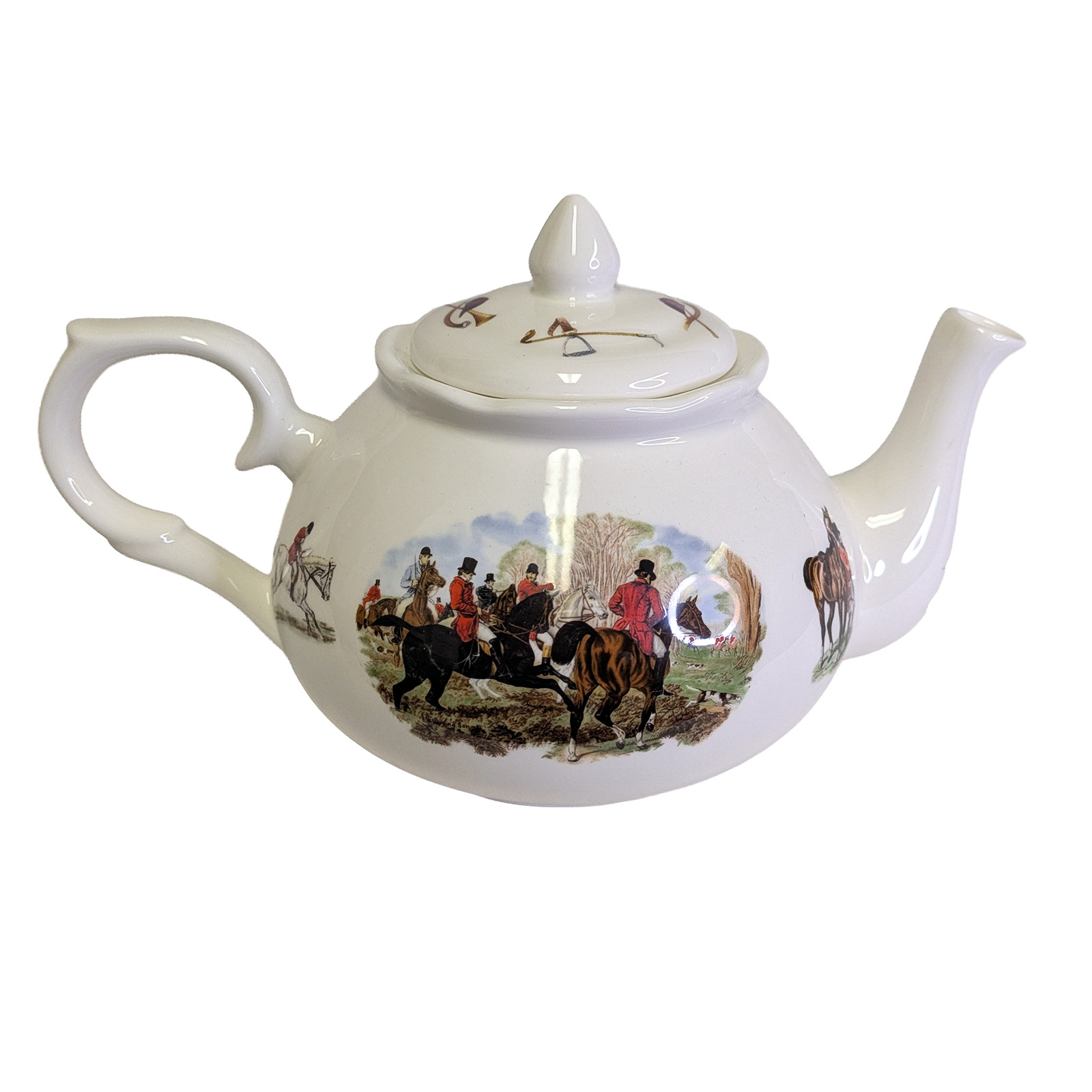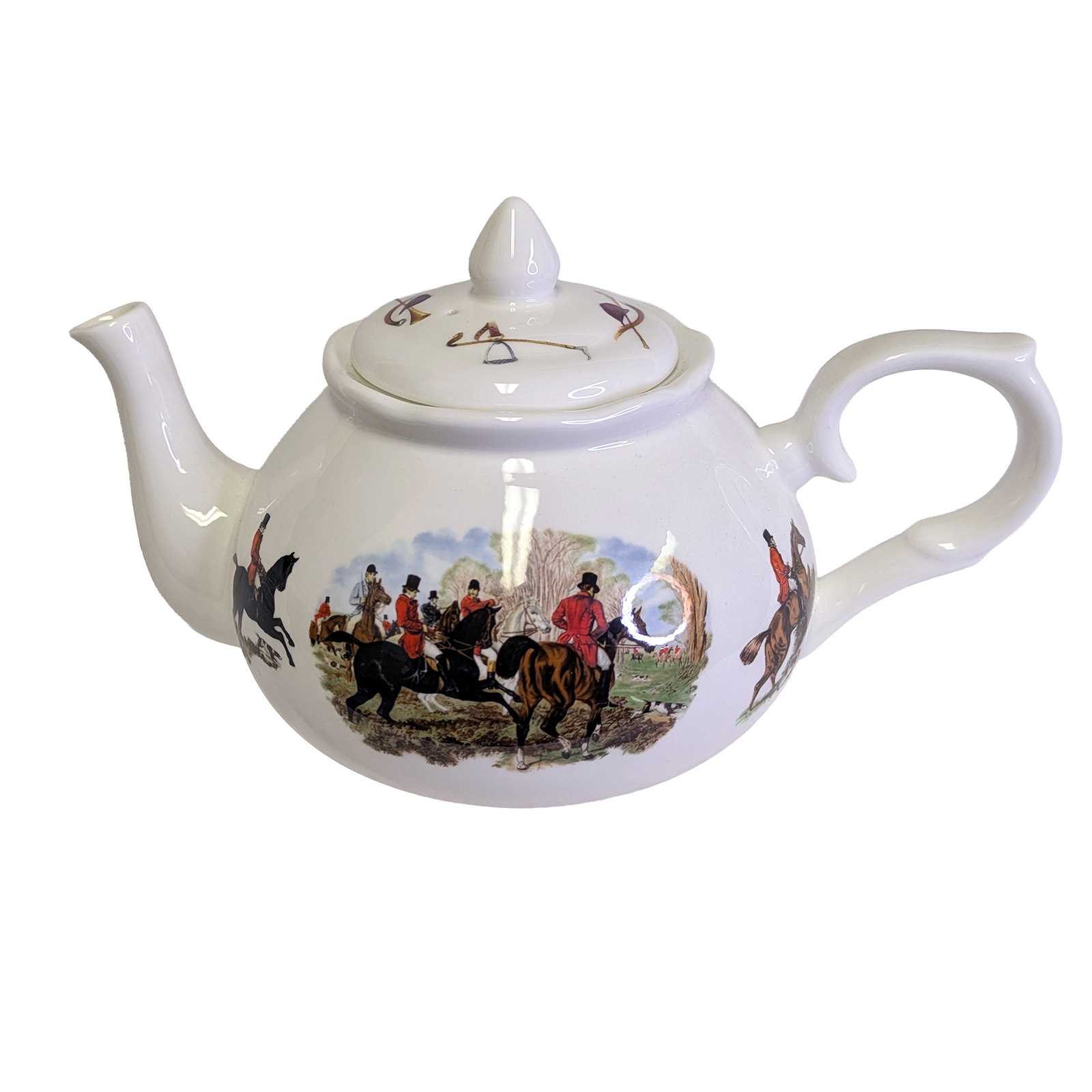 This lovely fine bone china teapot, featuring a hunting party scene, is crafted in England by Adderley Ceramics and makes a lovely addition to your at-home teatime. Hand wash recommended.