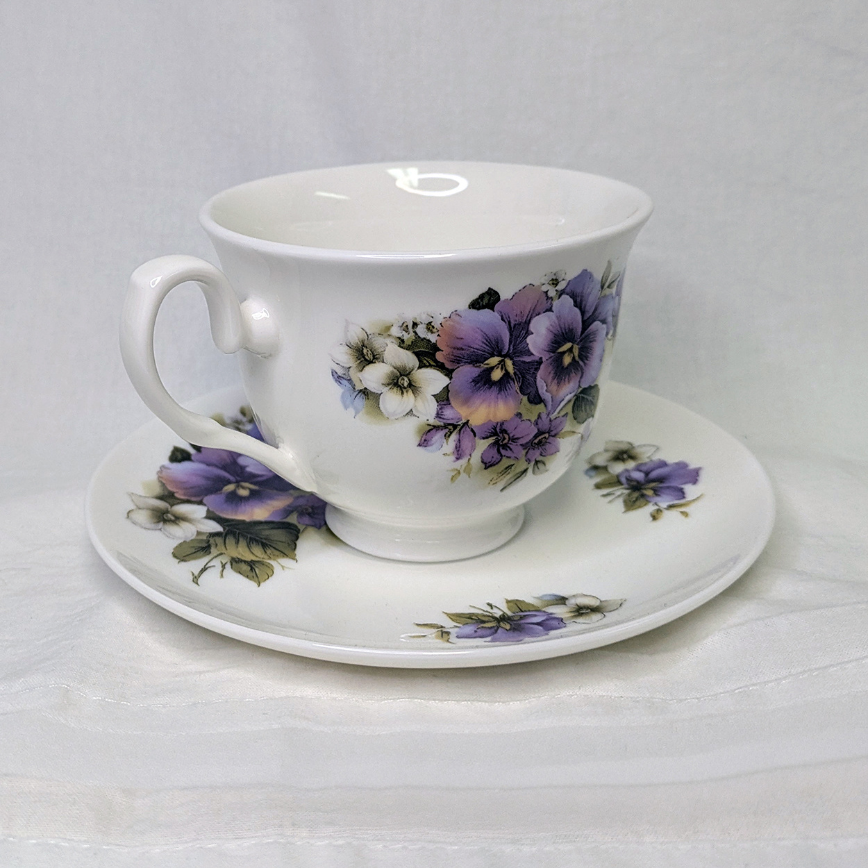 This lovely fine bone teacup and saucer, featuring a vibrant pansy motif, is made and hand-decorated in England by Adderley Ceramics and is the perfect addition to elevate your teatime at home. Hand wash recommended.