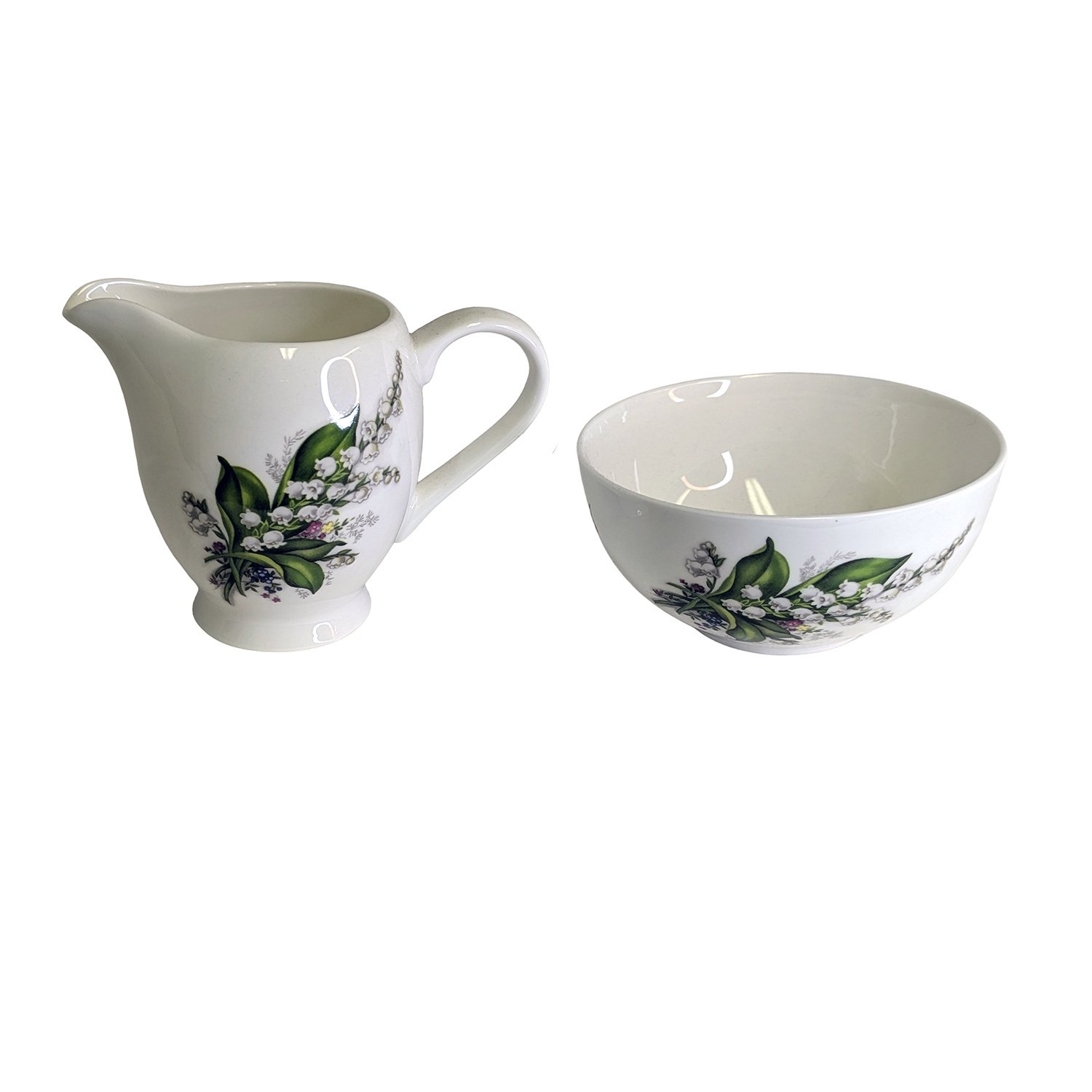 This lovely fine bone creamer and sugar bowl set, featuring a delicate lily of the valley motif, is made and hand-decorated in England by Adderley Ceramics and is the perfect addition to elevate your teatime at home. Hand wash recommended.