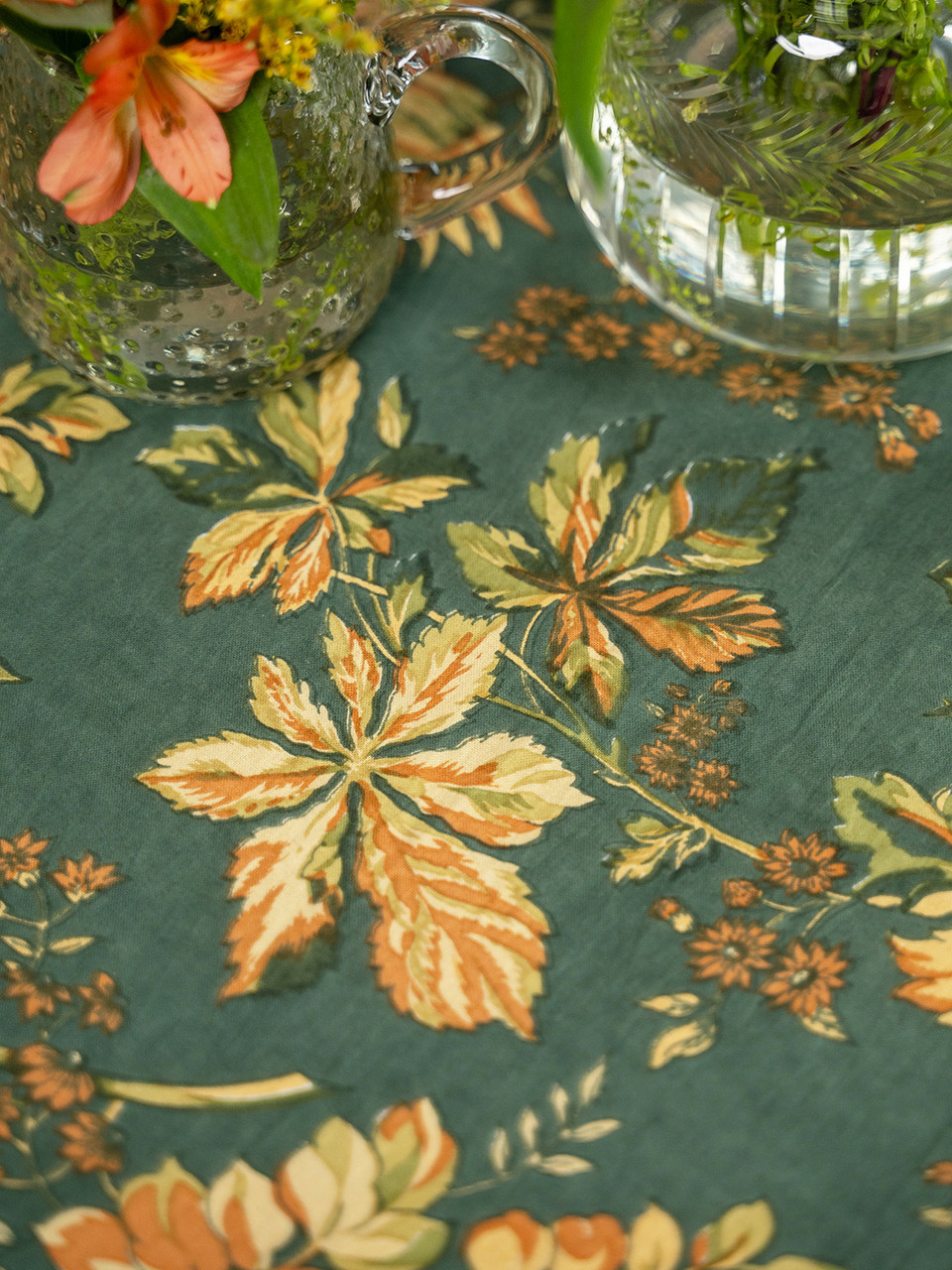 April Cornell has re-released her long-cherished Adirondack design on cotton, a colorful, heartfelt celebration of favorite fall fronds with attached printed border, French seams, and mitered corners. Individually screened, dyed, and embroidered by hand by skilled craftspeople in India. Returning print from the 1999 archives. Machine wash separately in cold water, tumble dry low, and warm iron if needed. This is the "Harvest" size, measuring 60" x 108", suitable for seating 8 to 12 people.