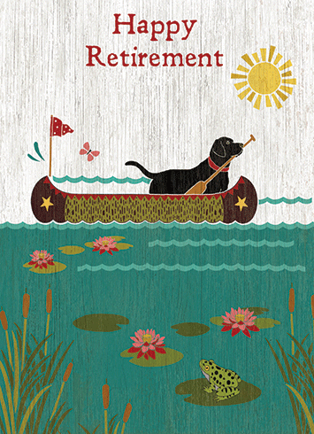 This retirement card with art by Suzanne Nicoll was printed in the USA on recycled textured paper. It comes with a color–coordinated envelope. The inside reads, "Time for a new adventure!".
