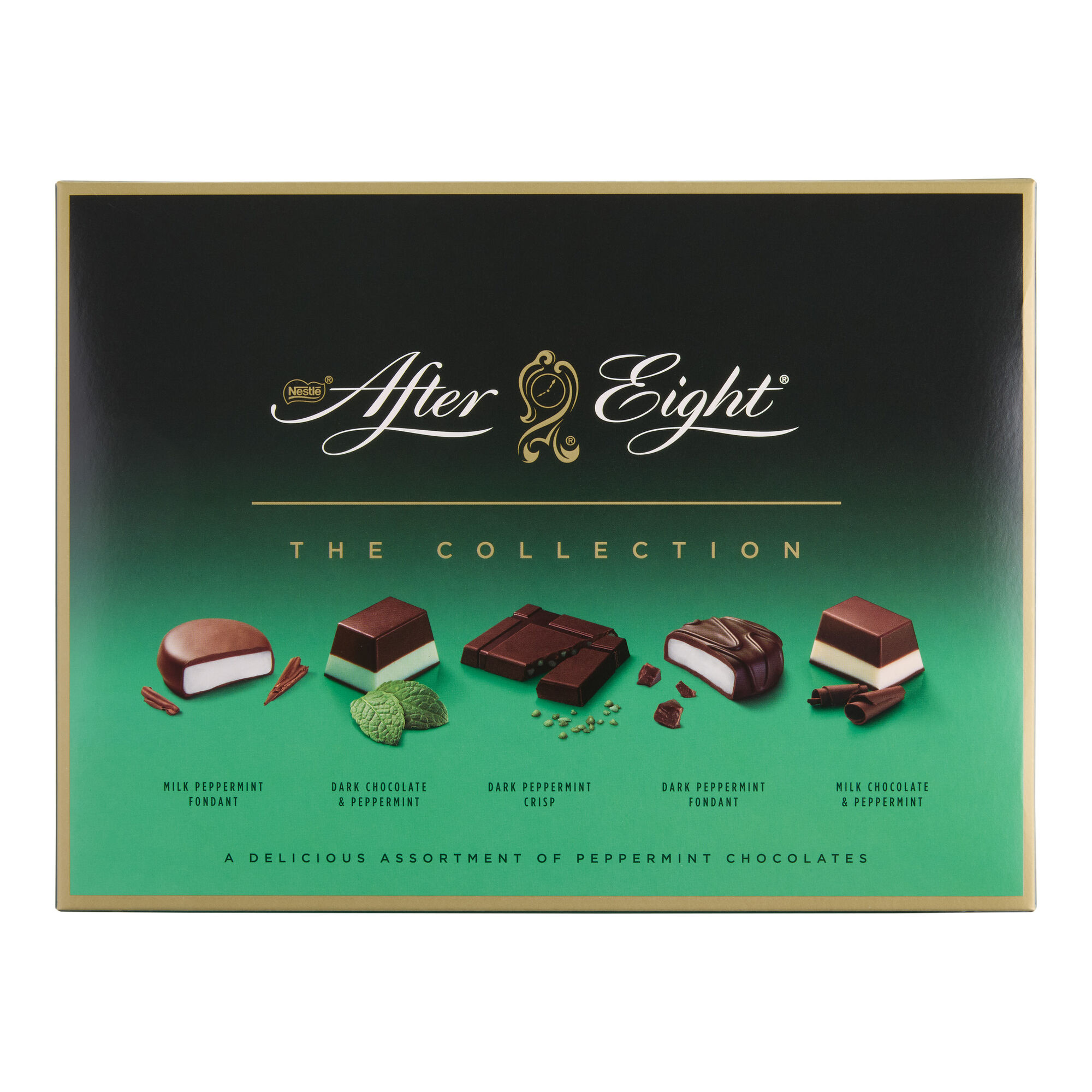 Dig into this collection box of mint chocolates by After Eight! It contains milk peppermint fondant rounds, dark chocolate and peppermint cubes, dark peppermint crisps, dark peppermint fondant rounds, and milk chocolate and peppermint cubes.