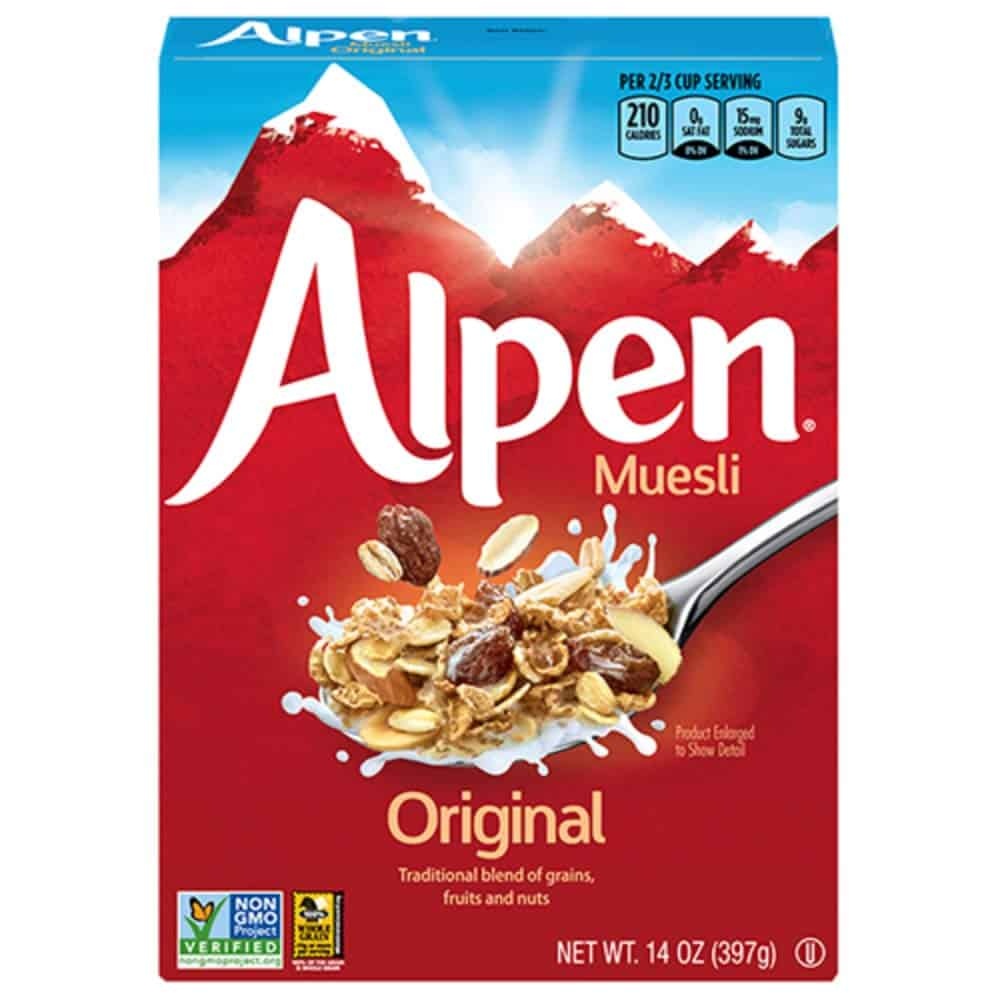 Ingredients: Wholegrain wheat (39%), wholegrain rolled oats (37%), raisins (12%), sugar, skimmed milk powder, milk whey powder, roasted sliced nuts (2%) (hazelnuts, almonds), salt.