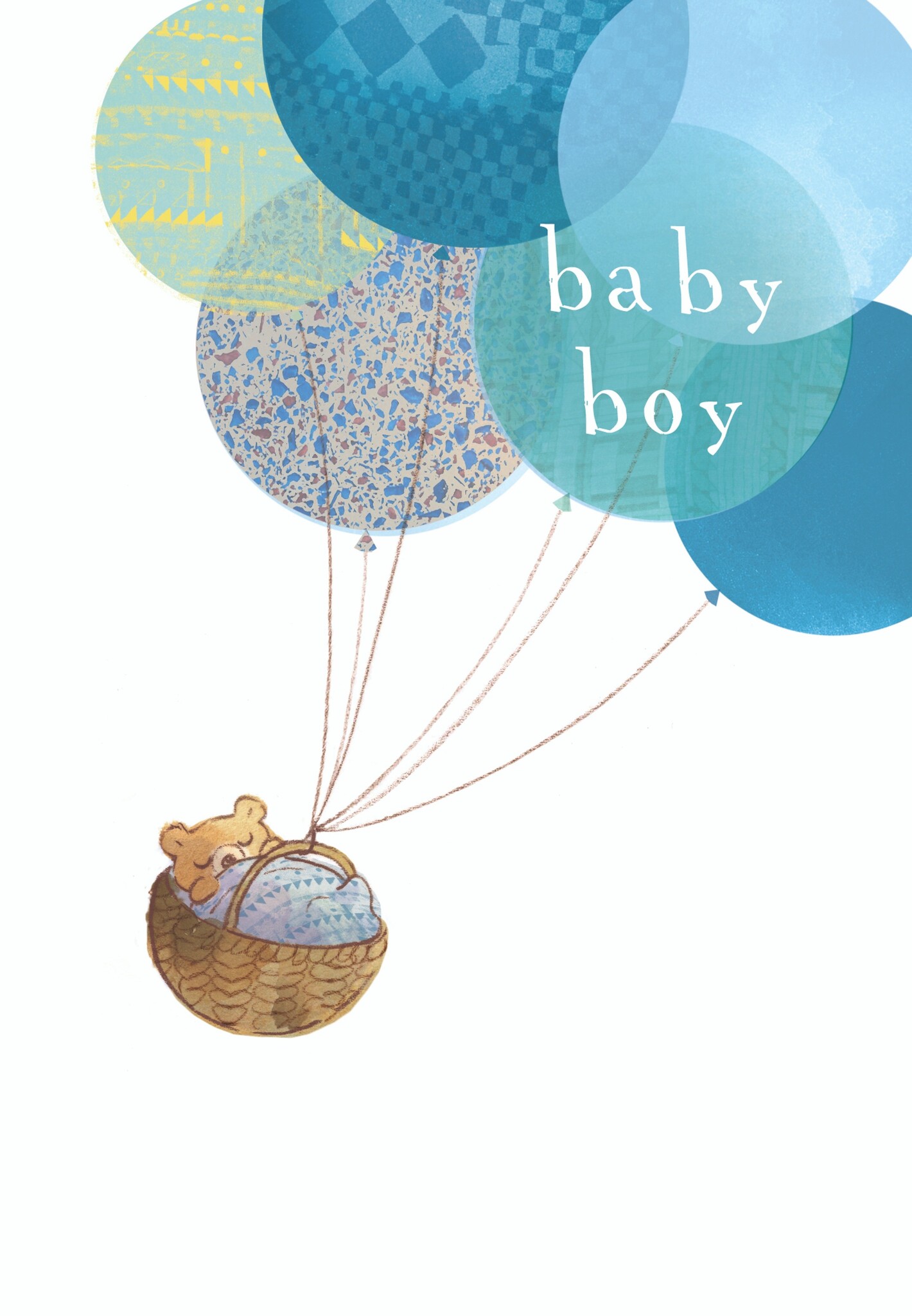 This card features a baby bear in a basket being lifted by a cloud of balloons, and the words "baby boy". The message inside reads, "Congratulations".