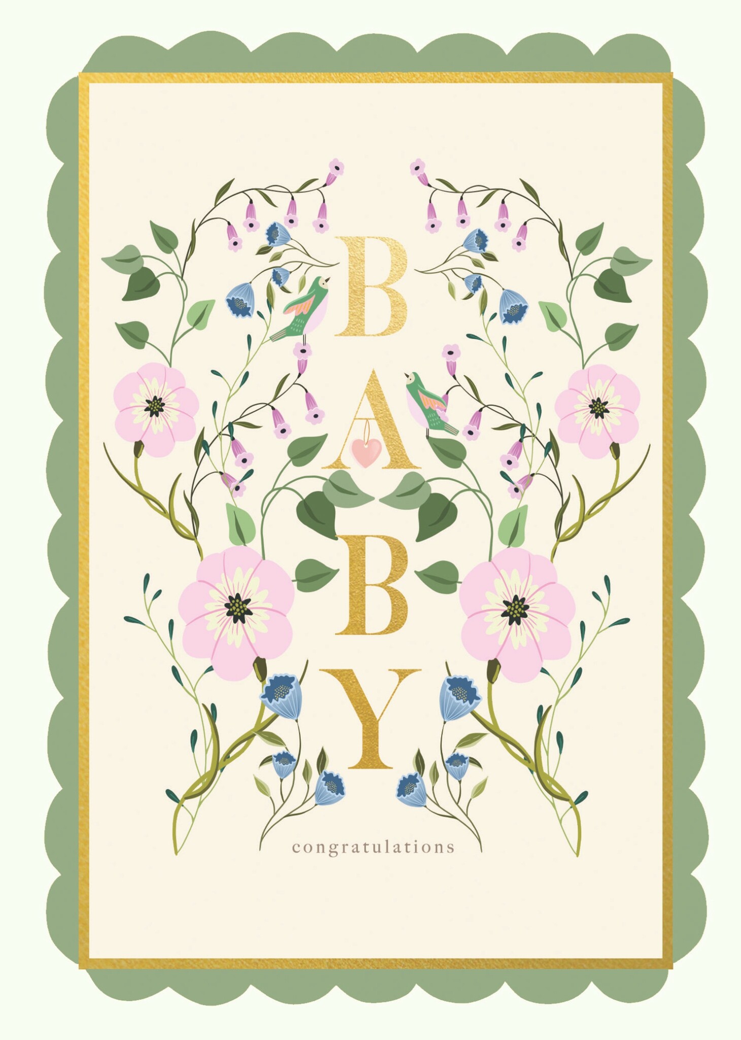 This card features a floral decoration and the words "baby" and "congratulations". It is blank inside for a personal message.