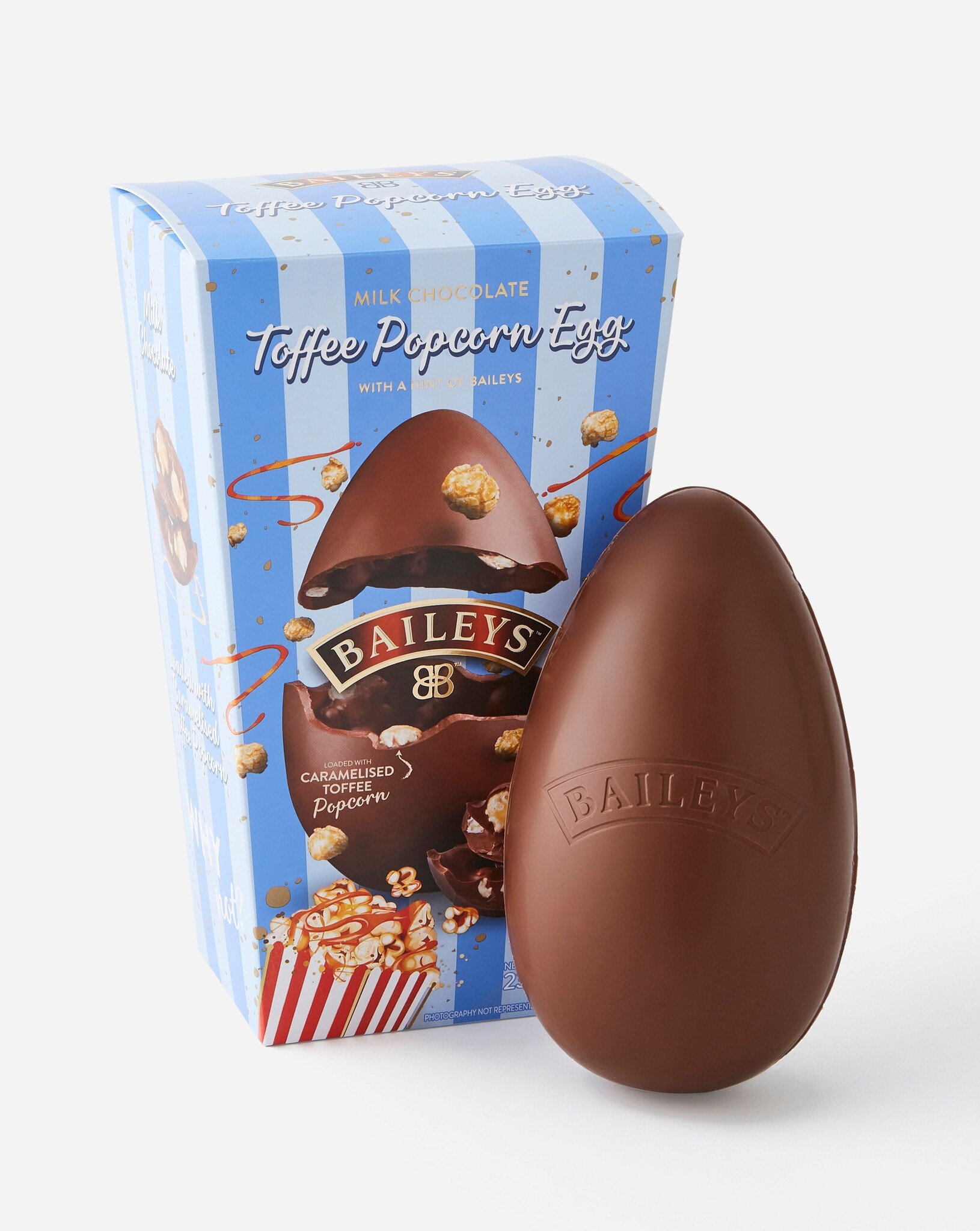 This hollow milk chocolate Easter egg comes with caramelised toffee popcorn inclusions and is flavored with a hint of Baileys.