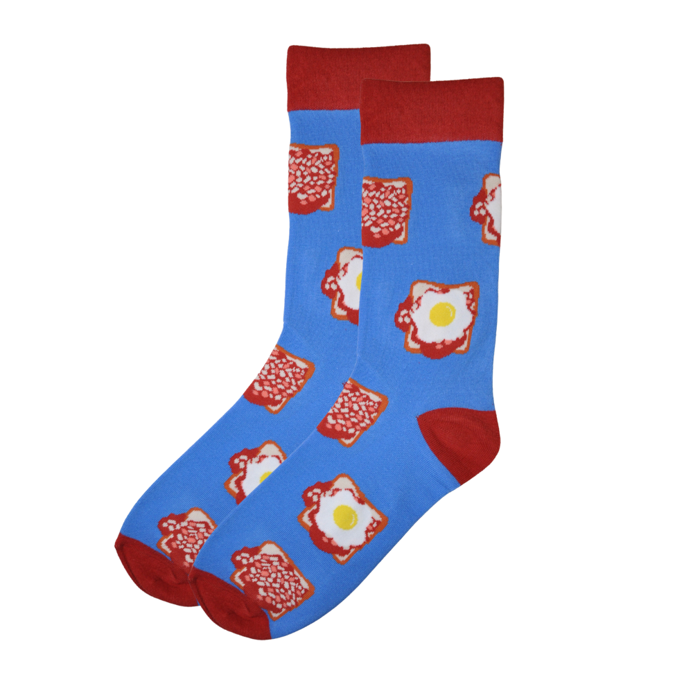 These Beans on Toast Socks feature tasty breakfasts on a blue background, with pops of red at the ankle, toe and heel. Made from a cozy, breathable cotton blend with reinforced toes and heels, they're the perfect blend of comfort and charm.