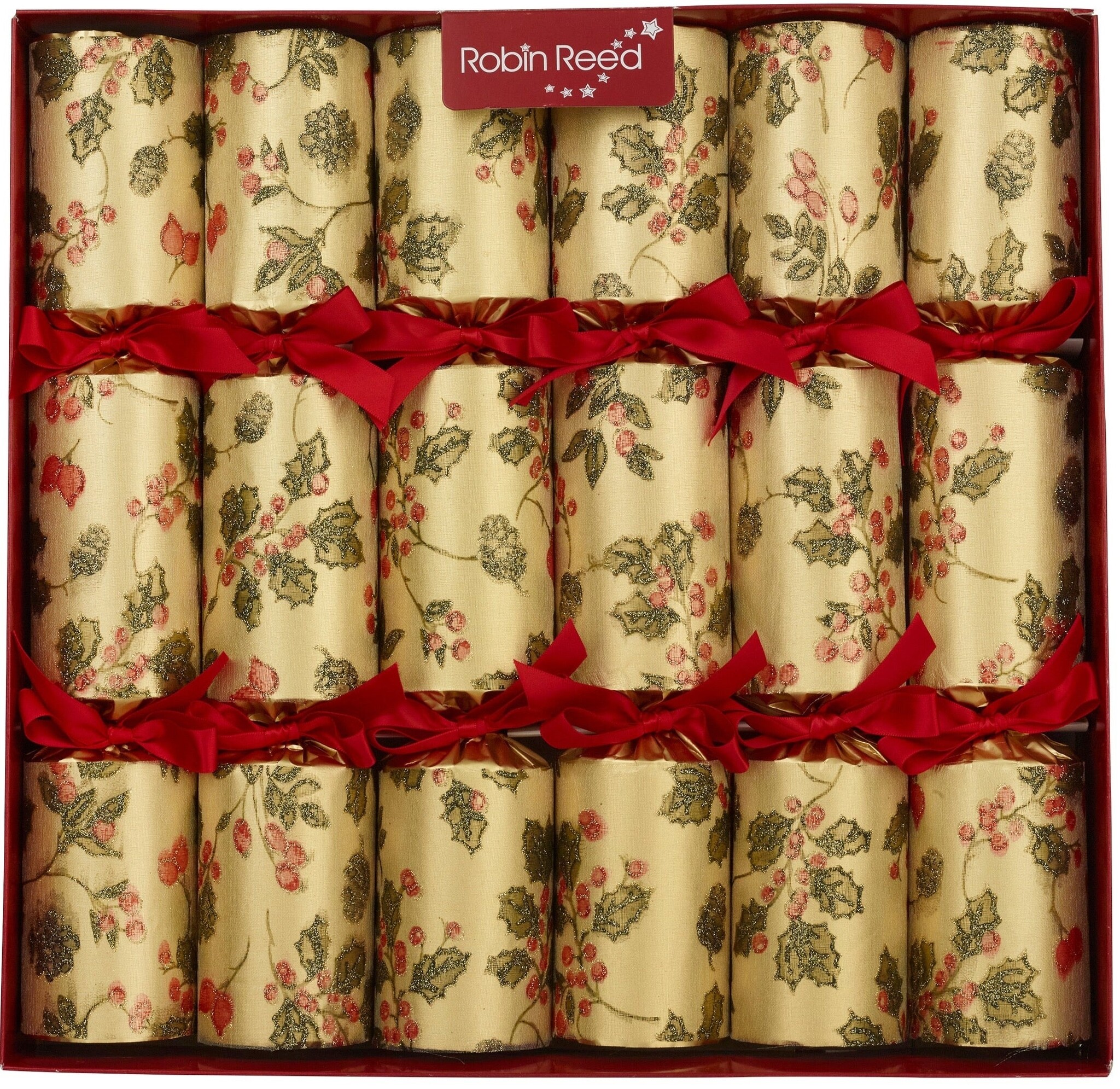 Robin Reed Berry Garland Christmas Crackers are traditional, handmade English Christmas crackers featuring a decorative gold holly design, complete with party favors inside. Pull apart with a friend to reveal a bang, a paper crown, a joke, and a small piccadilly gift.