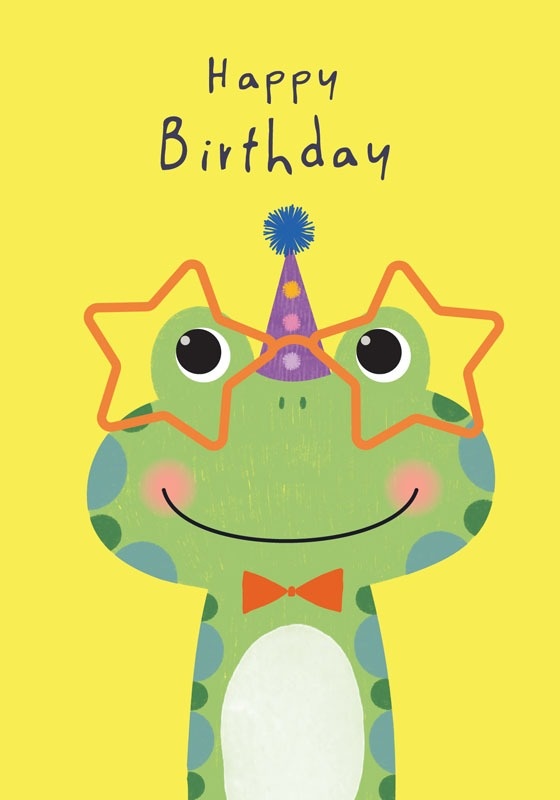 Wish someone a happy birthday with this card, featuring a smiling frog in birthday attire. It is blank inside for a personal message.