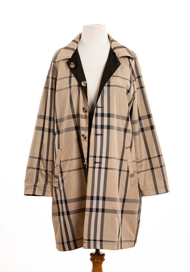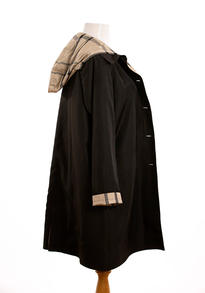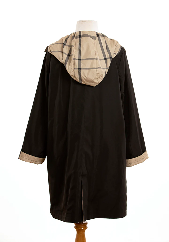 This reversible black and plaid rain trench coat is the perfect light weight jacket for all occasions. This coat has two front pockets on either side, long sleeves and back vent and detachable hood. The coat is water-repellent, fast-drying and easy to store in its matching travel pouch.