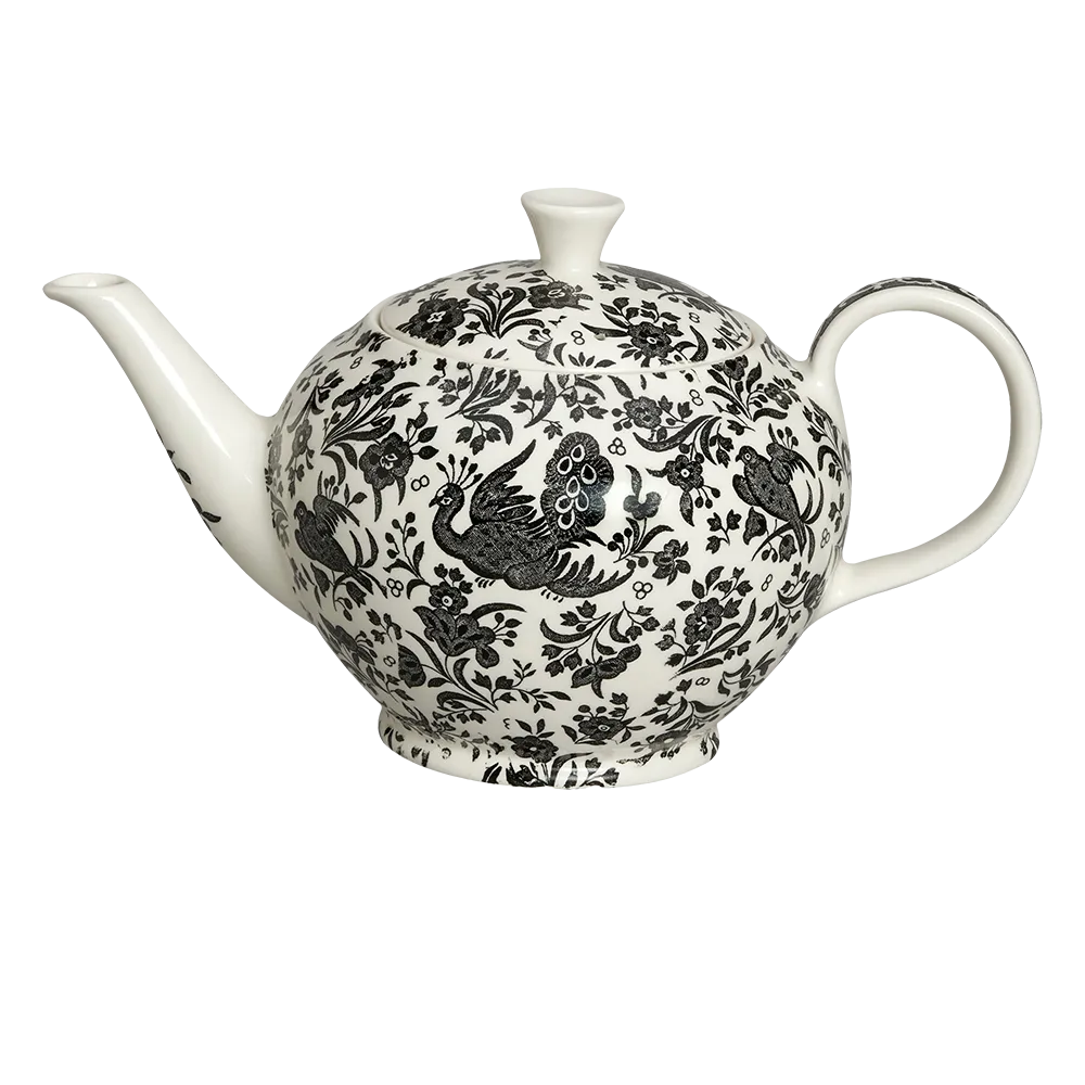 This large teapot is a classic piece of Burleigh pottery, featuring a striking and elegant black and white pattern of peacocks and intricate details. It is a modern, monochrome take on a classic Burleigh design that was first introduced in 1913 and revived in 2013.