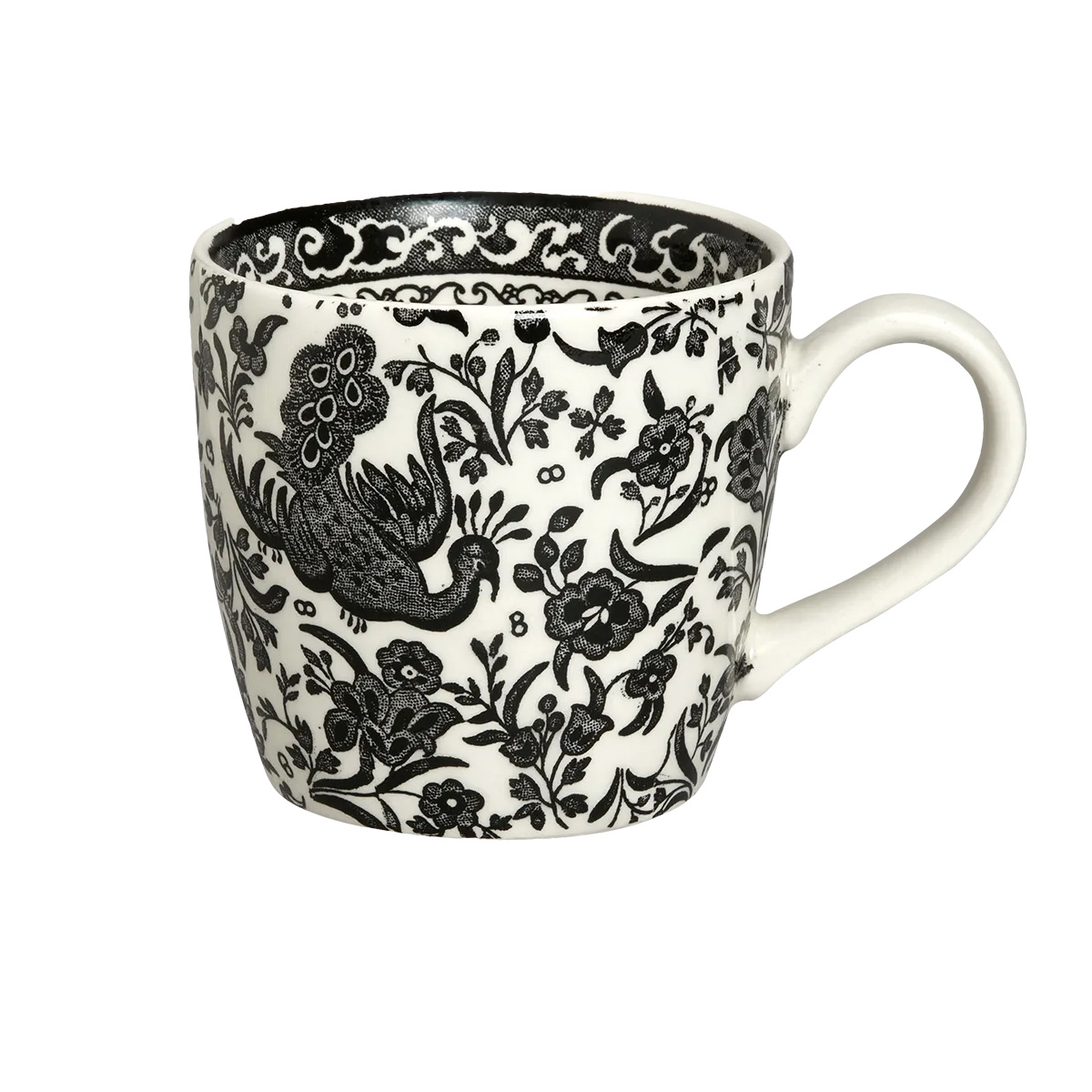This Black Regal Peacock Osbourne mug is decorated with Burleigh's classic Regal Peacock pattern, which features an oriental bird motif first introduced in 1913. The Osborne mug is modern and generously sized, designed to fit comfortably in your hands with a gently tapered form.