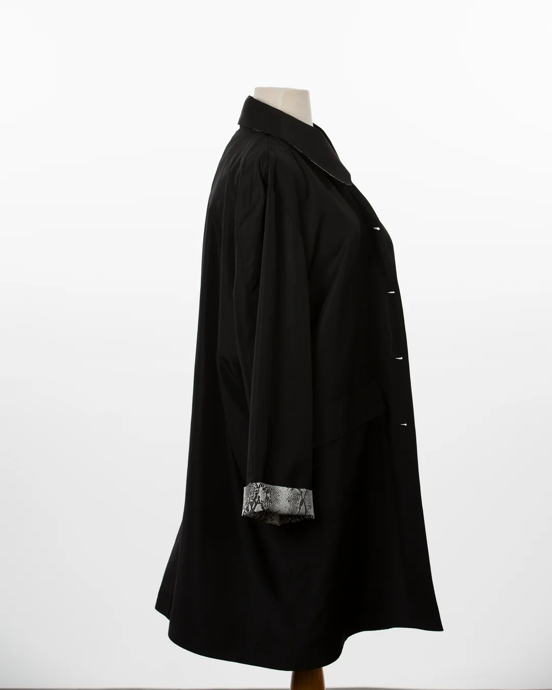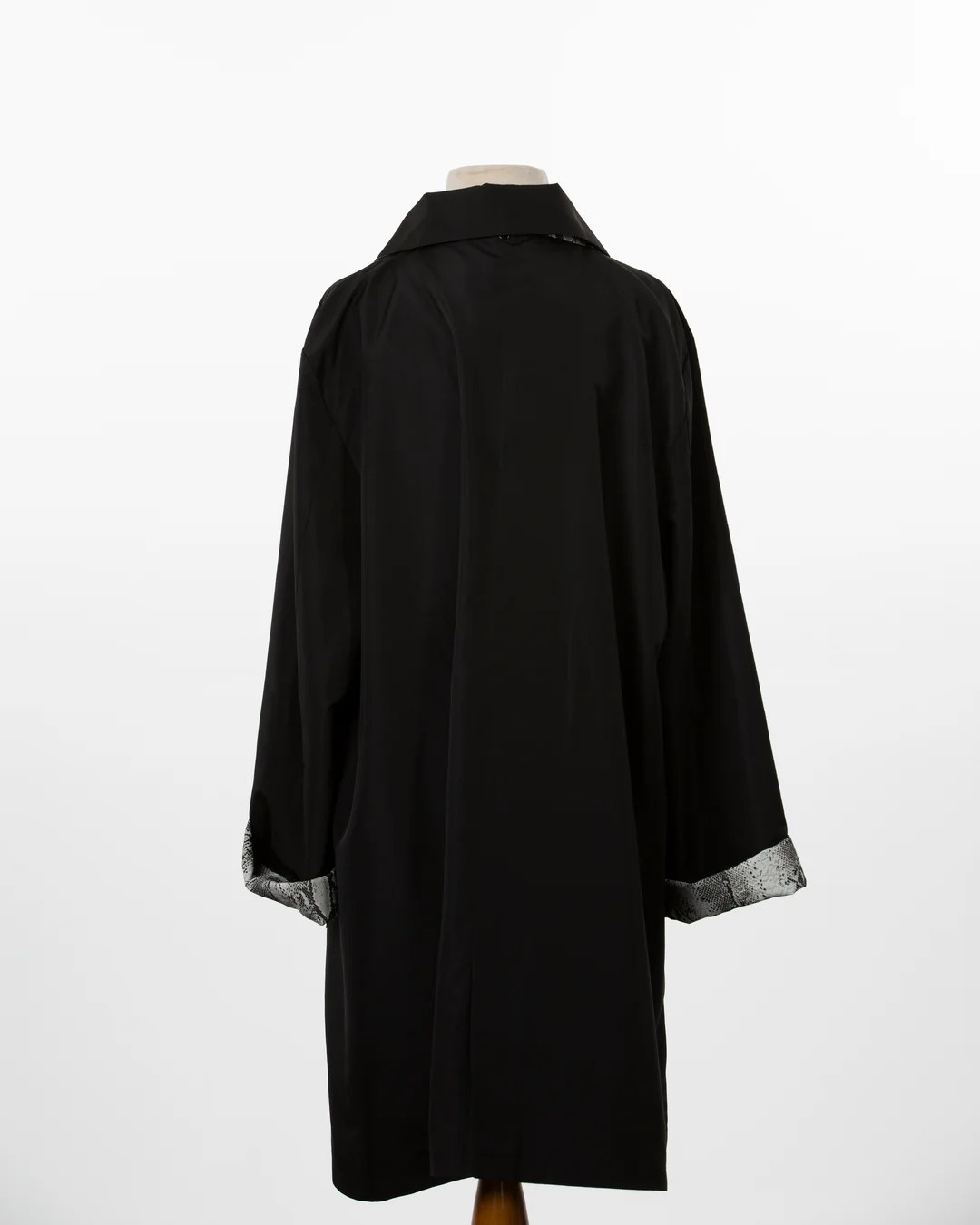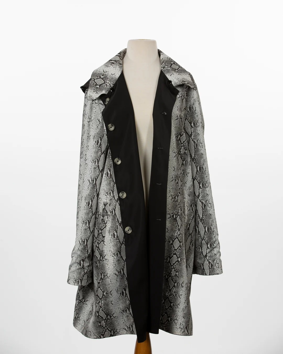 This reversible black and tan snakeskin pattern rain trench coat is the perfect light weight jacket for all occasions. This coat has two front pockets on either side, long sleeves and back vent and detachable hood. The coat is water-repellent, fast-drying and easy to store in its matching travel pouch.