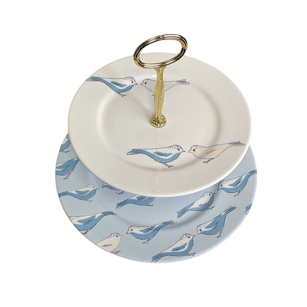 Complete your tablescape with this two tier cake stand, produced by artisan pottery company Roy Kirkham. Steeped in the rich heritage of English ceramics, it is made of durable and elegant fine bone china and decorated with an exclusive blue bird design. Hand wash recommended. Made in Stoke-on-Trent, England.
