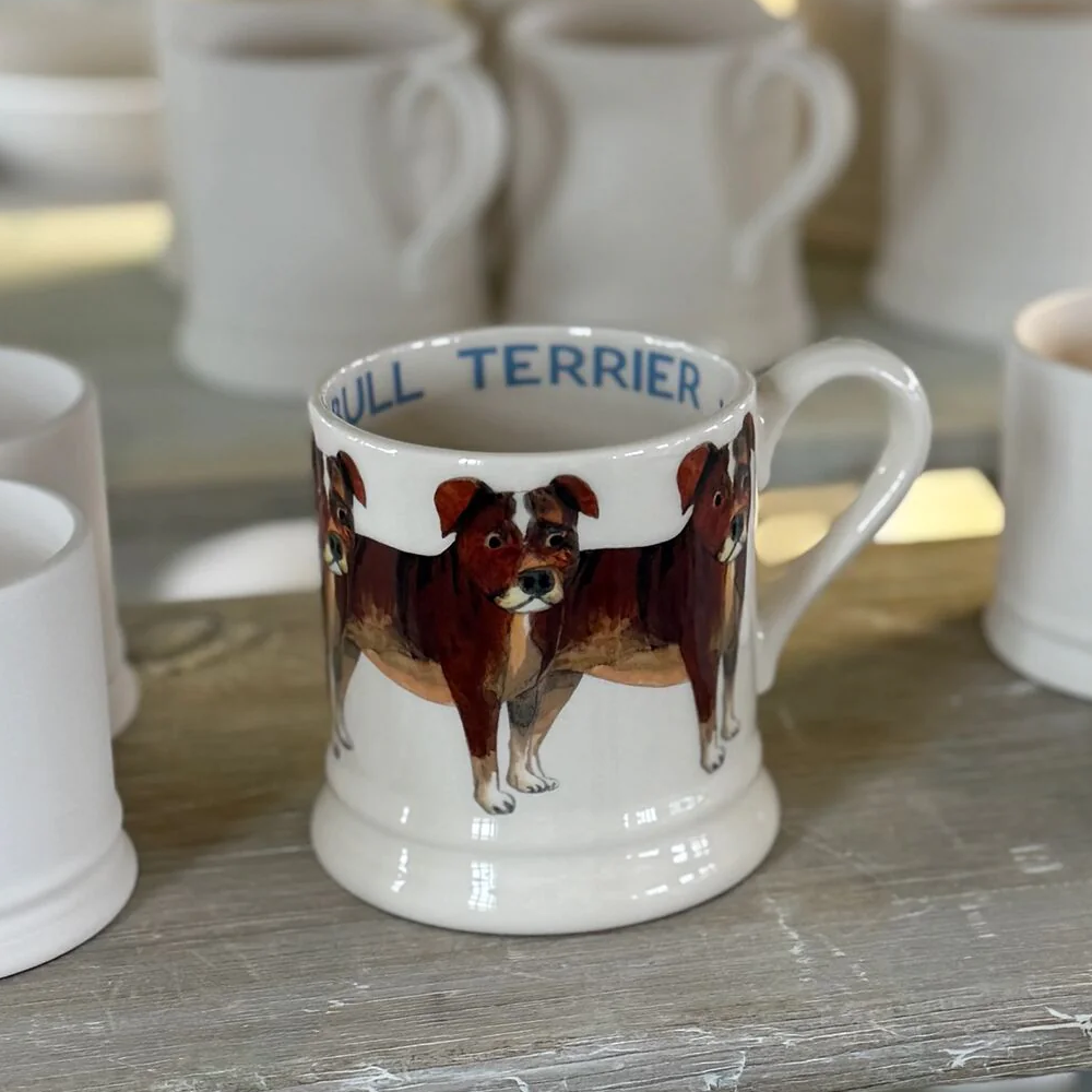 Given the Emma Bridgewater factory location in Stoke-on-Trent, Staffordshire, it’s highly appropriate for them to include a pottery mug featuring the breed named after the county: a Staffordshire Bull Terrier 1/2 Pint Mug. The Staffy, or Stafford, is good-natured (of course), has strength and agility (as you’d expect), and is friendly and enthusiastic (all the best qualities!) One of the Staffordshire Bull Terrier’s most noticeable features is their keen, intelligent expression, just like the one on the dogs on this coffee mug—a clever Staffordshire, cleverly created in Staffordshire.