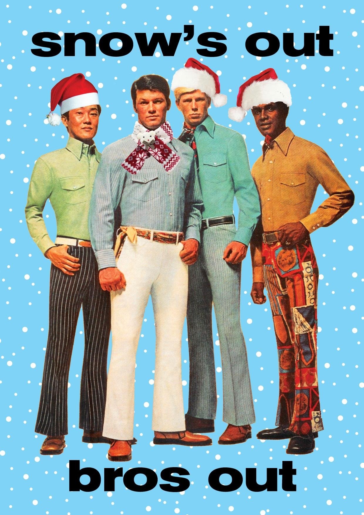 Snow's out Bros out! Retro, sassy, a little twisted, and filled with that cutting British wit, this Christmas card from Kiss Me Kwik is sure to put a smile on the recipient's face. Blank inside.