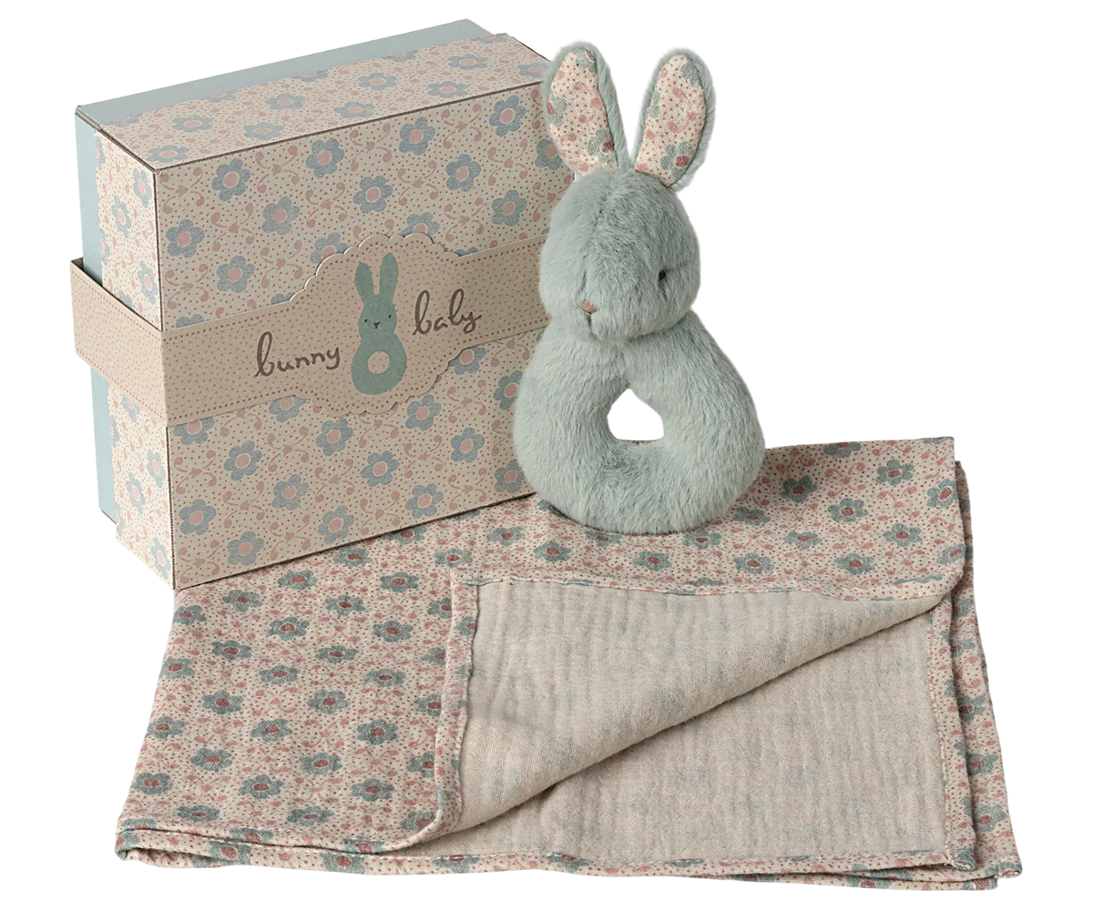 A perfect gift idea for the little ones. The set includes a soft cotton cloth and a small rabbit rattle. The rabbit has a small rattle inside that makes a soft sound. It all comes in a beautiful gift box.