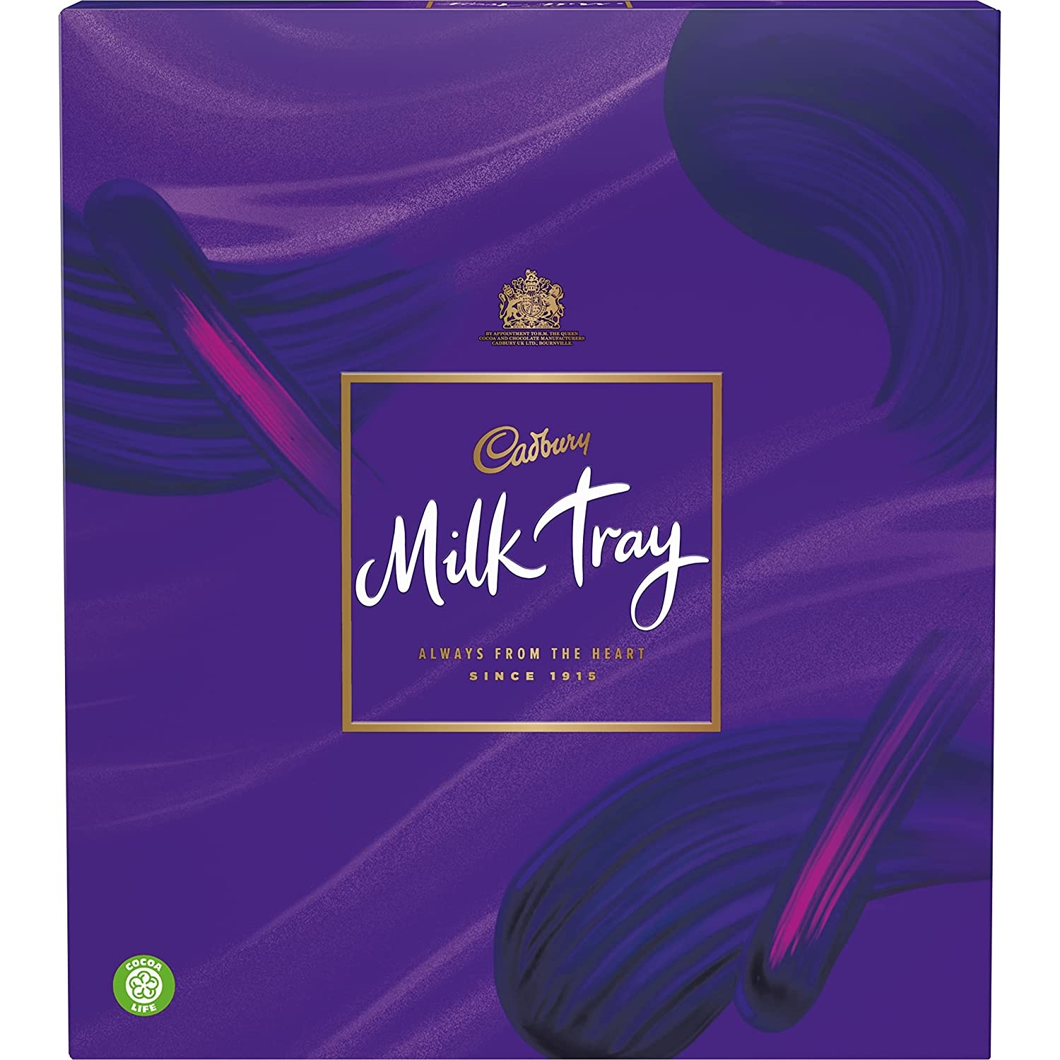 A selection of delicious Cadbury chocolates in a double-layered Milk Tray Box. Each Layer contains 17 indvidual chocolates: 2x Salted Caramel Charm; 2x White Truffle; 2x Fudge Duet; 2x Hazelnut Swirl; 2x Orange Truffle; 2x Honey Crunch; 2x Perfect Praline; 1x Caramel Softy; 1x Truffle Heart; 1x Raspberries & Cream