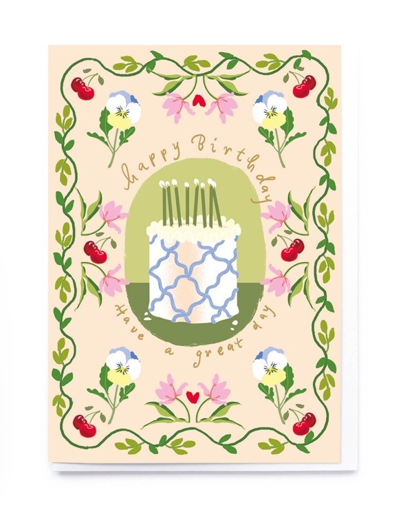 Wish someone a happy birthday with this card, featuring a birthday cake and a floral border. It is embellished with gold foil and is blank inside for a personal message.
