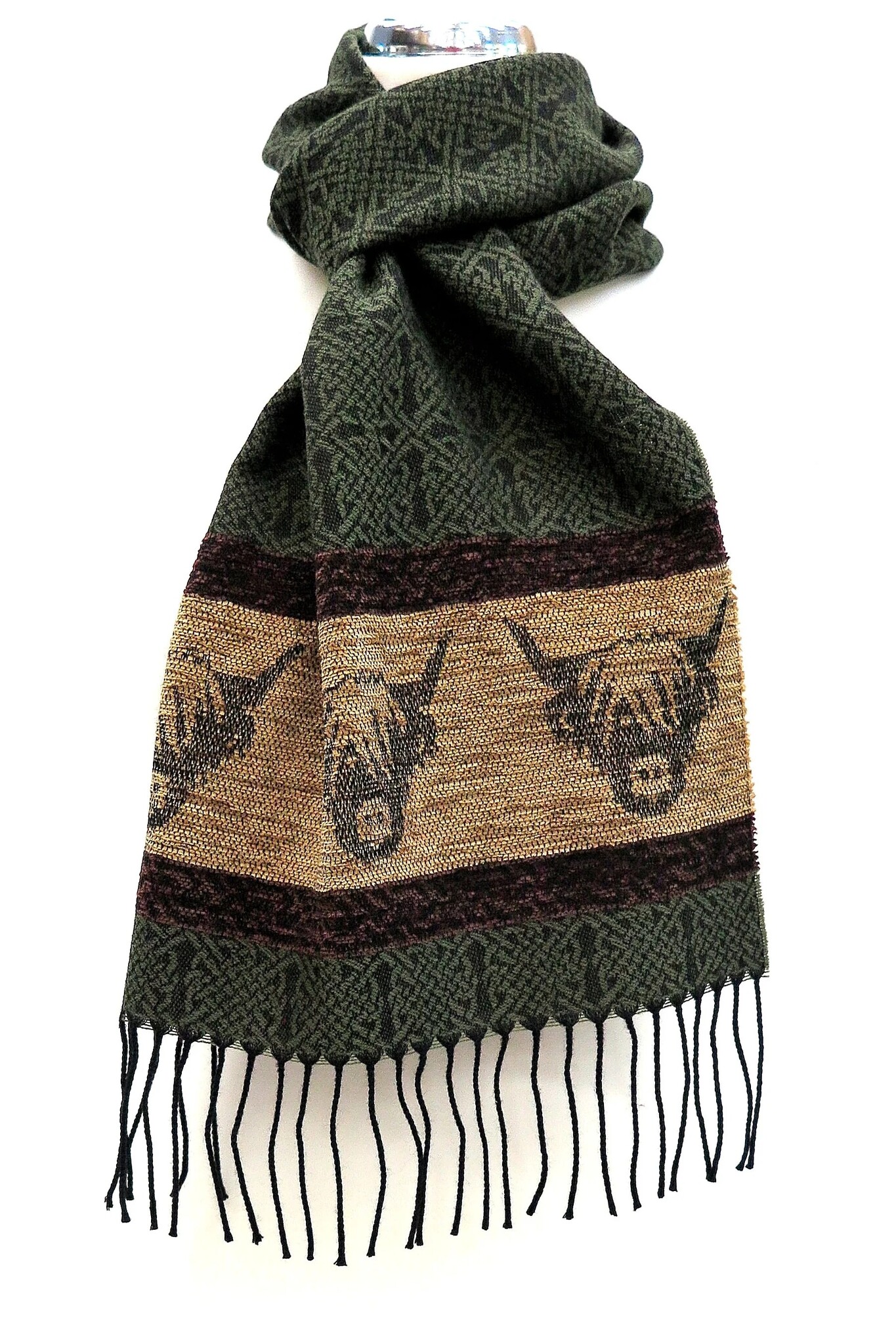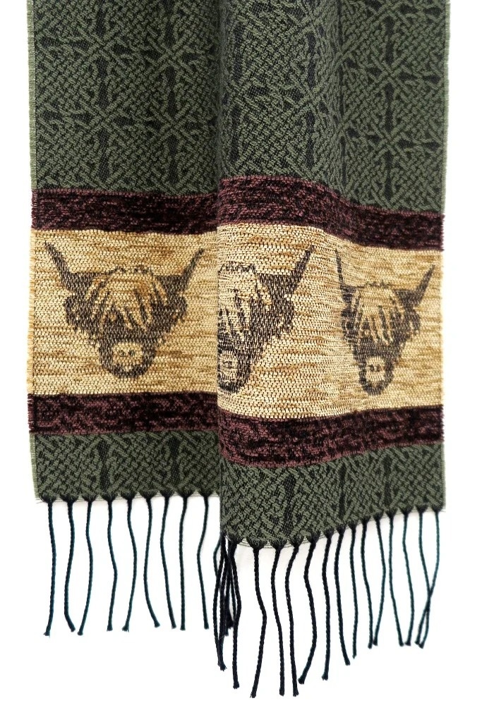 The Celtic Alba Highland Cow Loden Jacquard Scarf is inspired by one of Scotland's most loved domestic animals: the highland cow is tremendously hardy and dates back to the 6th century.