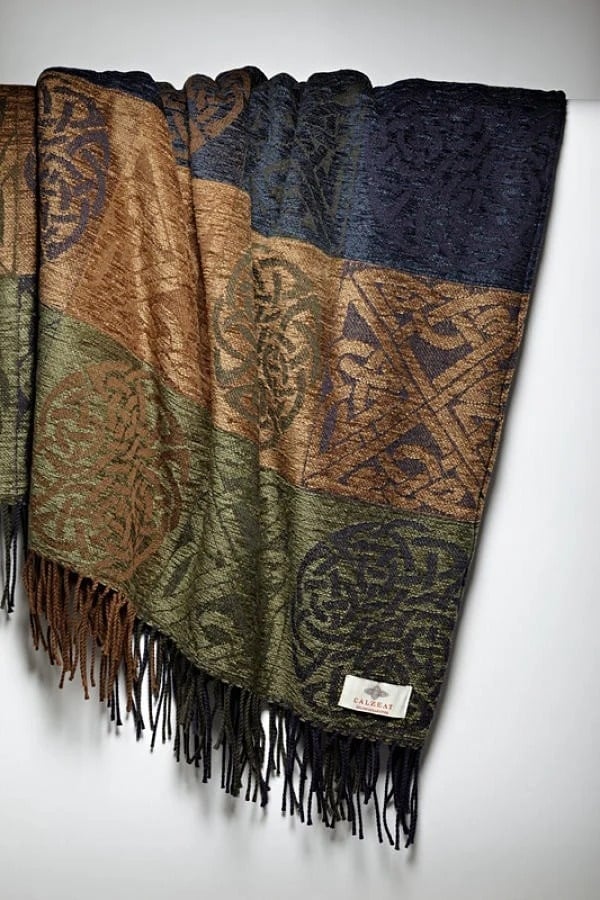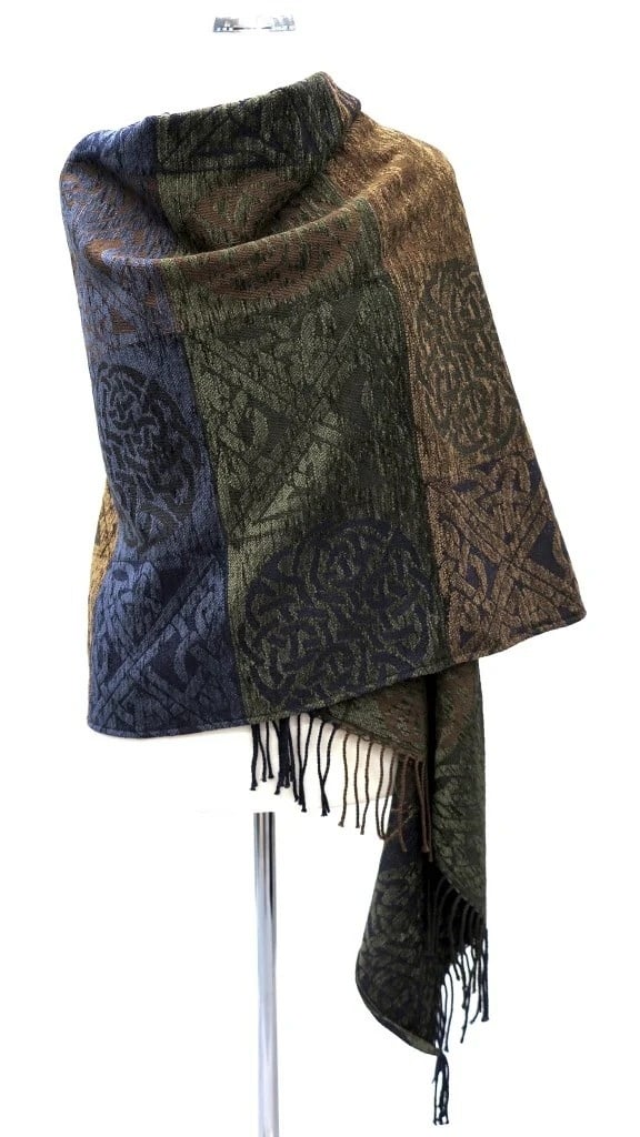 The Clansman colorway on this wrap is a combination which evokes the strength of the Celtic warrior: a strong palette of navy blue, bottle green and golden brown. It features Celtic Knots, the most recognised artwork in Celtic history. The Circular Knot, seen as a symbol of unity and eternity, is joined by a square knot known as a Shield Knot to offer protection from evil spirits. Both are referred to as the mystic or endless knots.