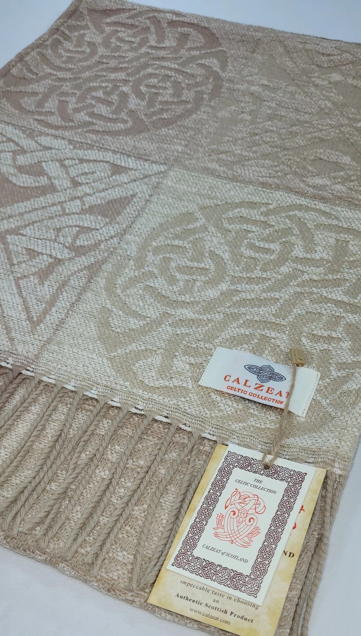 The Linen colorway on this wrap is a pale palette of beige and tan. It features Celtic Knots, the most recognised artwork in Celtic history. The Circular Knot, seen as a symbol of unity and eternity, is joined by a square knot known as a Shield Knot to offer protection from evil spirits. Both are referred to as the mystic or endless knots.