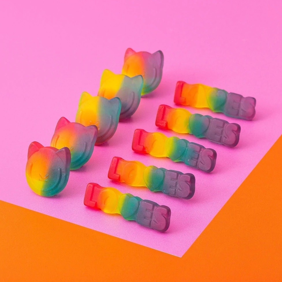 Product descriptionCandy Kittens LOVES is a fruity explosion of blueberry, cherry, orange, and strawberry. Suitable for vegans.