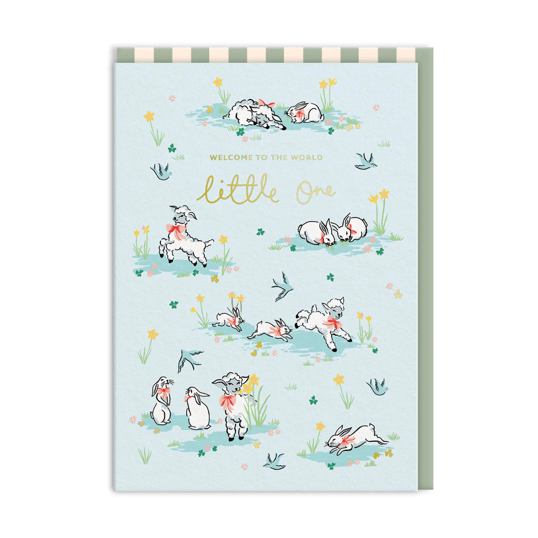 This card reads, "Welcome to the world little one" amid pictures of lambs and bunnies. It comes with a striped envelope and is blank inside for a personal message.