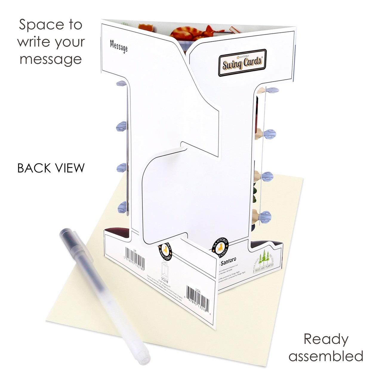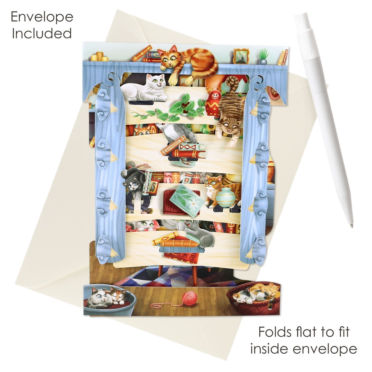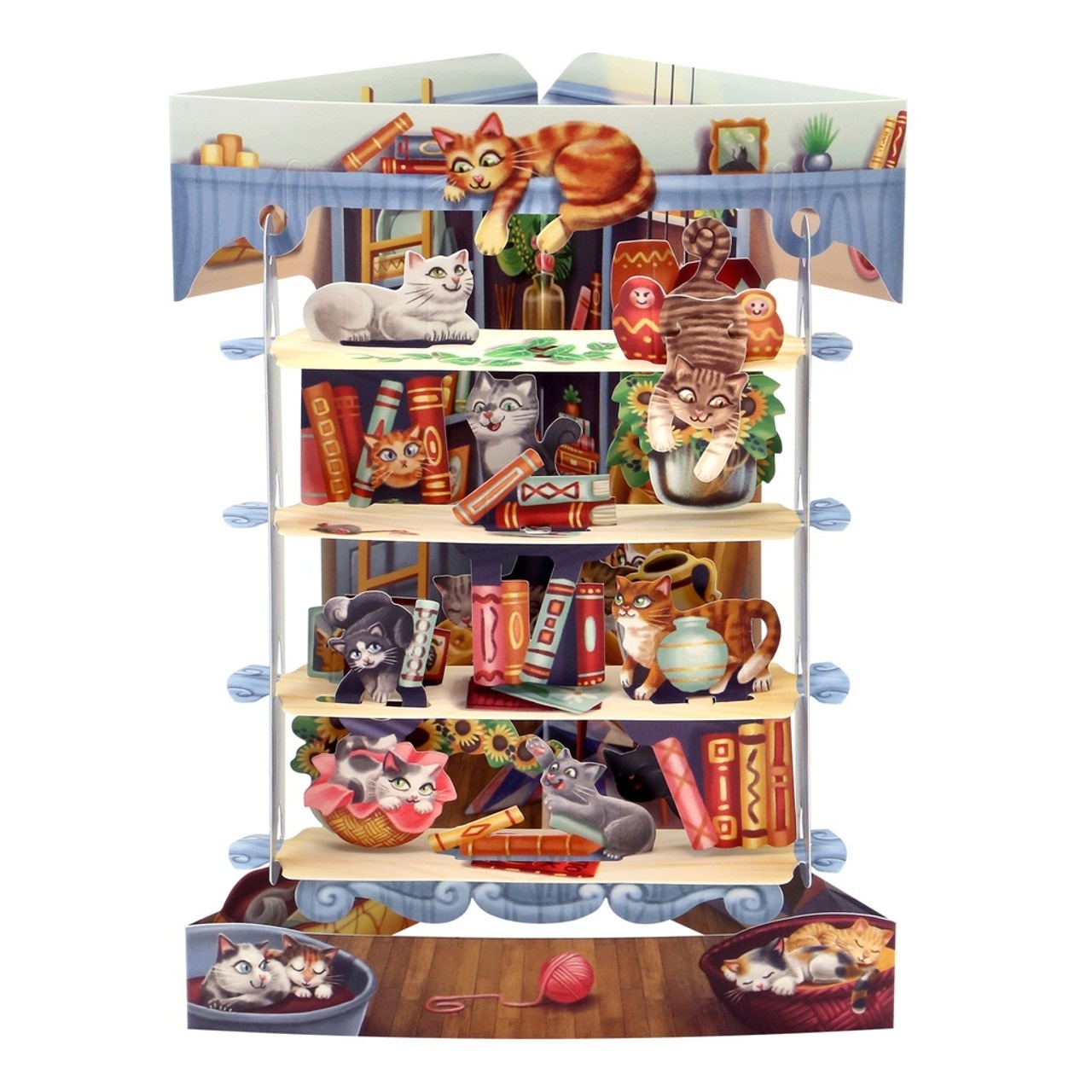 Invite a sense of whimsy with this super fun Cats in the Library Swing Card, featuring a playful cohort of kitties making mischief on a bookshelf. Ready assembled and with space for your own personalized message, this Swing Card opens to form an incredible illustration with real moving components. Folds flat into an envelope. Engineered, designed and printed in the UK.