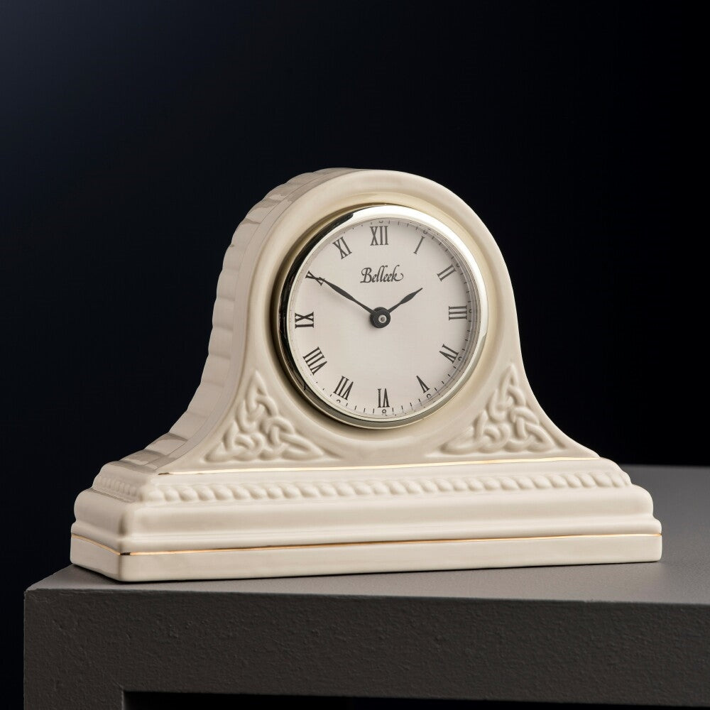 The Belleek Celtic Mantel Clock is an elegant timepiece crafted from premium Irish porcelain by Belleek Pottery in Ireland, featuring intricate, embossed Celtic knotwork inspired by the Book of Kells, with gold accents. Handcrafted through Belleek's renowned 16-hand process, it has a smooth, marble-like finish. It serves as both a decorative piece and a functional gift, embodying a blend of Irish heritage and timeless design. Handcrafted and hand-painted in Ireland.