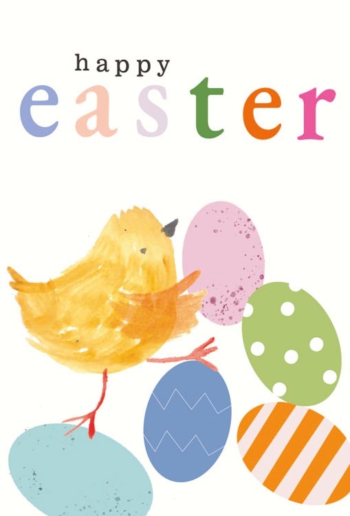 Wish someone a happy Easter with this card, featuring a chick frolicking with dyed eggs. It is blank inside for a personal message.
