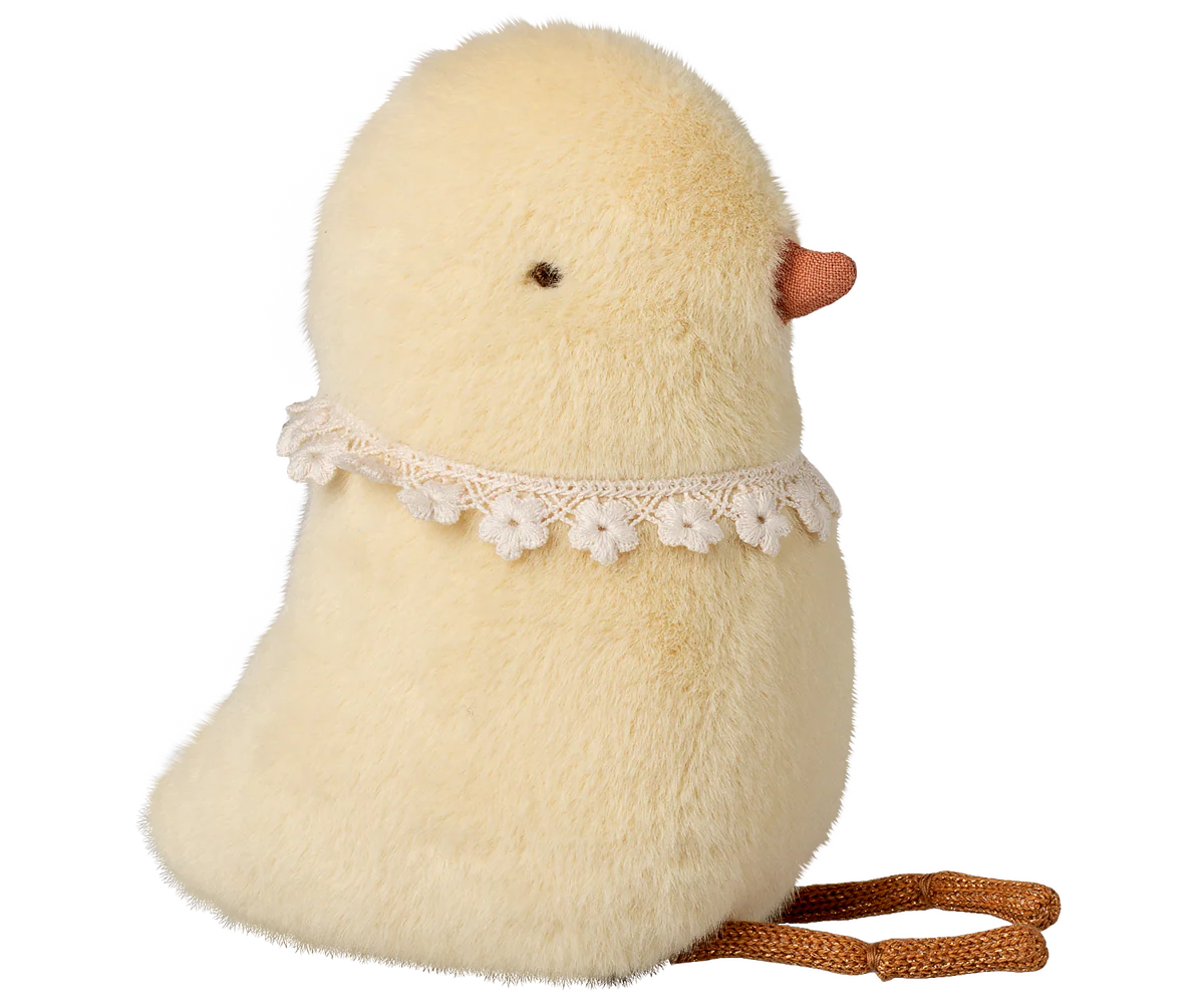 This small plush chick is perfect for a tiny hand. The mini-sized chicken has the sweetest look and a very soft hand feel. The small legs are made of knitted string with golden effect.