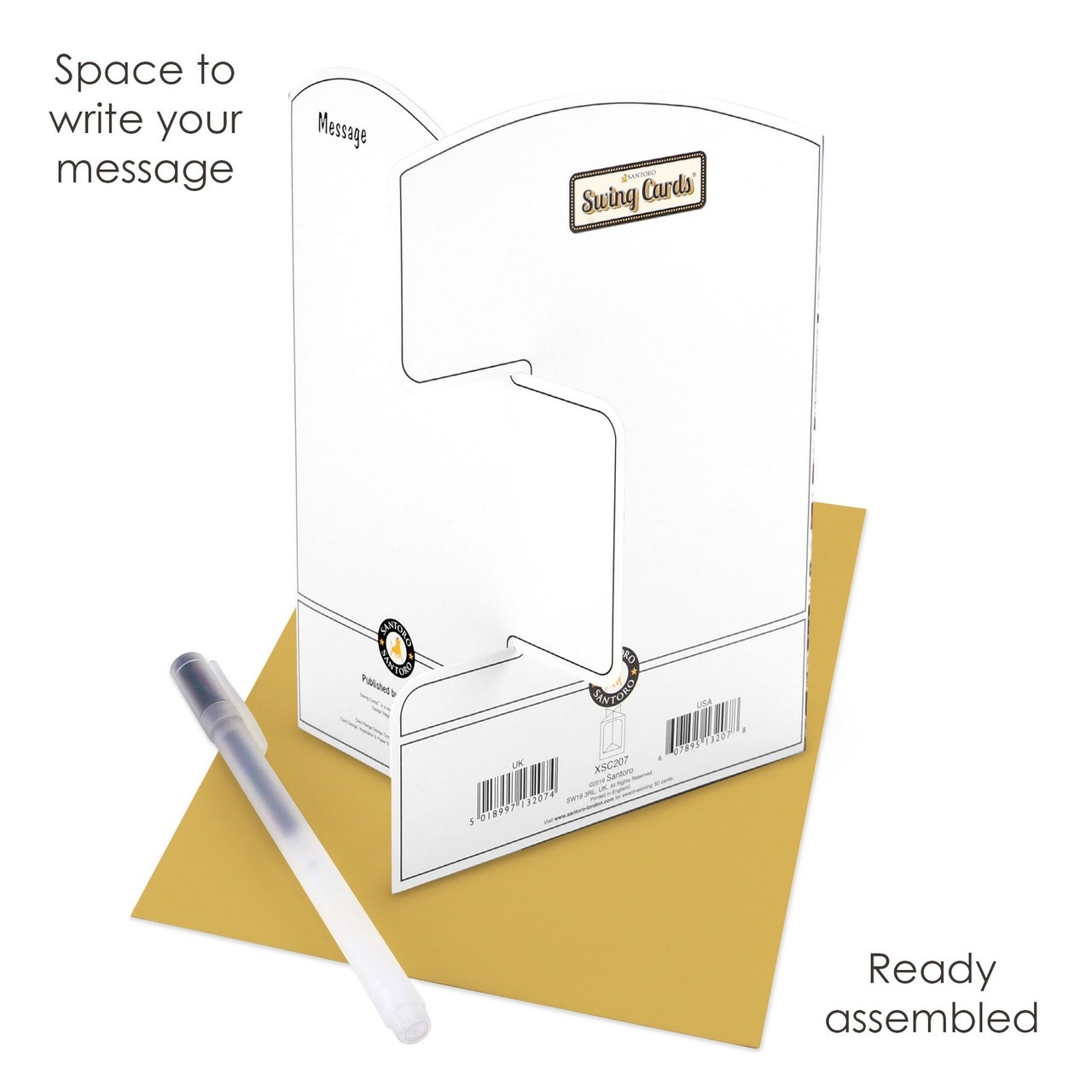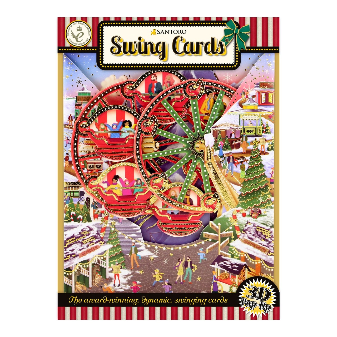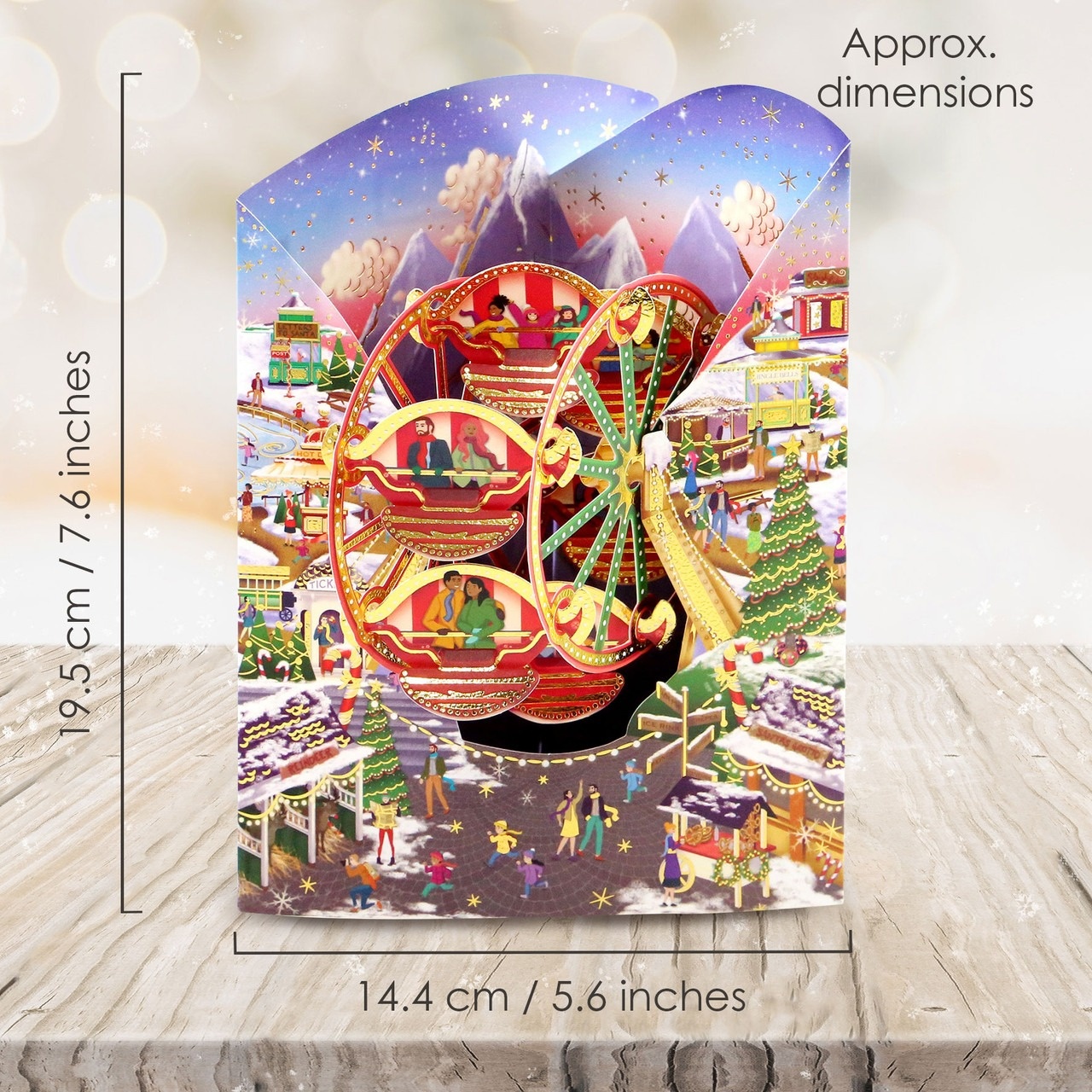 Celebrate the Christmas season with this super fun Christmas Market Swing Card, featuring a wintery fair with a Ferris wheel. Ready assembled and with space for your own personalized message, this Swing Card opens to form an incredible illustration with real moving components. Folds flat into an envelope. Engineered, designed and printed in the UK.