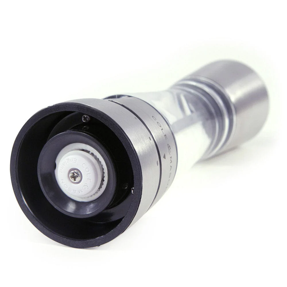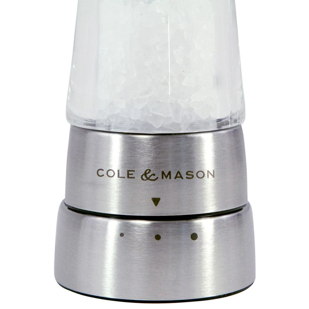 The Cole & Mason 7.5" Derwent Stainless Gourmet Salt Mill offers a sleek profile in stainless steel and acrylic that brings professional seasoning and control to everyday kitchens. Simply twist the collar on the base to 3 pre-selected settings to achieve fine to coarse grinds during and after cooking. Use a coarse grind on salad tomatoes for extra texture or a fine grind for soups and sauces. This salt mill features a push top cap for easy refilling. The grinding mechanism on this mill is guaranteed for life. Pair with the Cole & Mason Derwent Pepper Mill to complete the set!
