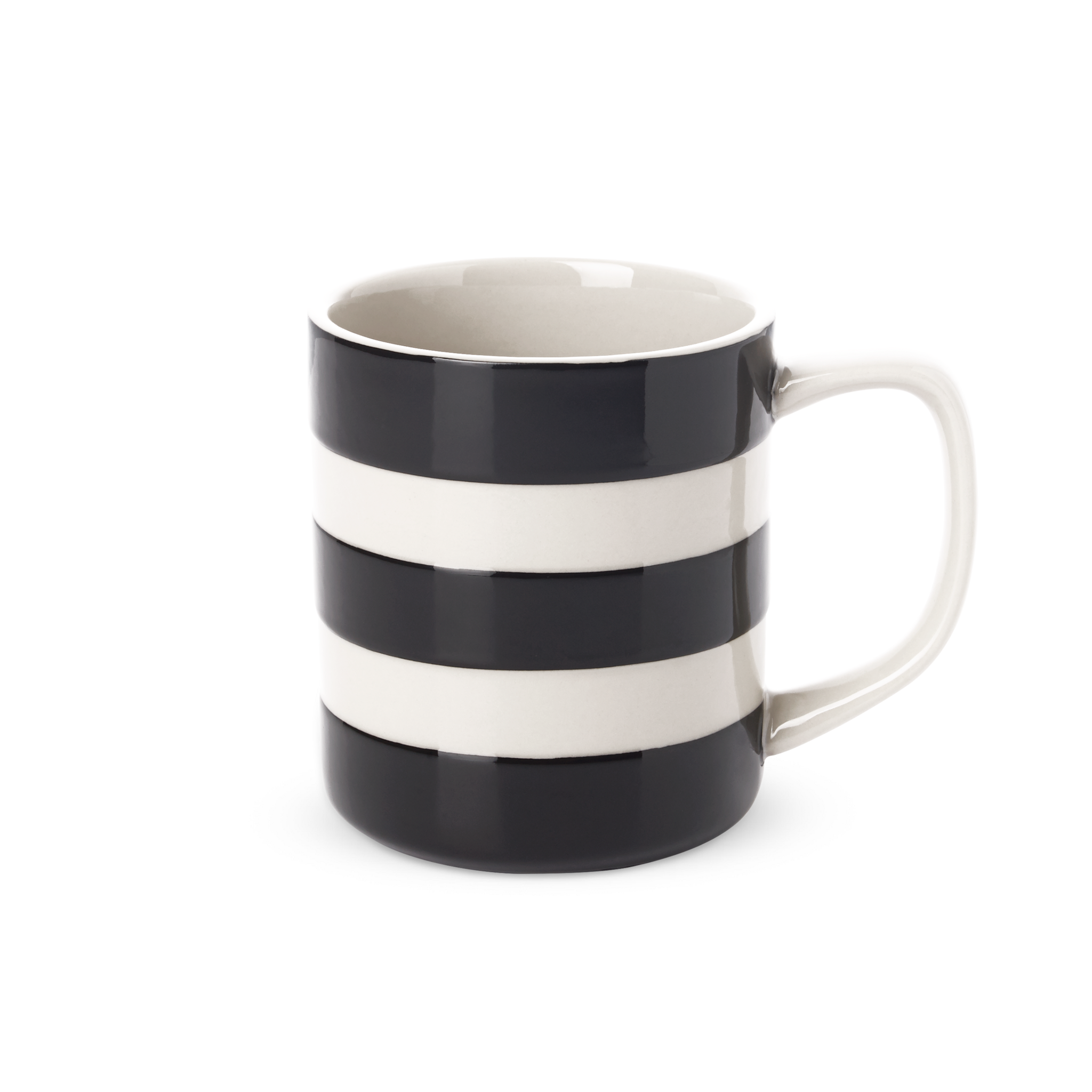 This splendid straight-sided, three-hooped black mug is just the thing for when it’s time for tea. Dishwasher and microwave safe.
