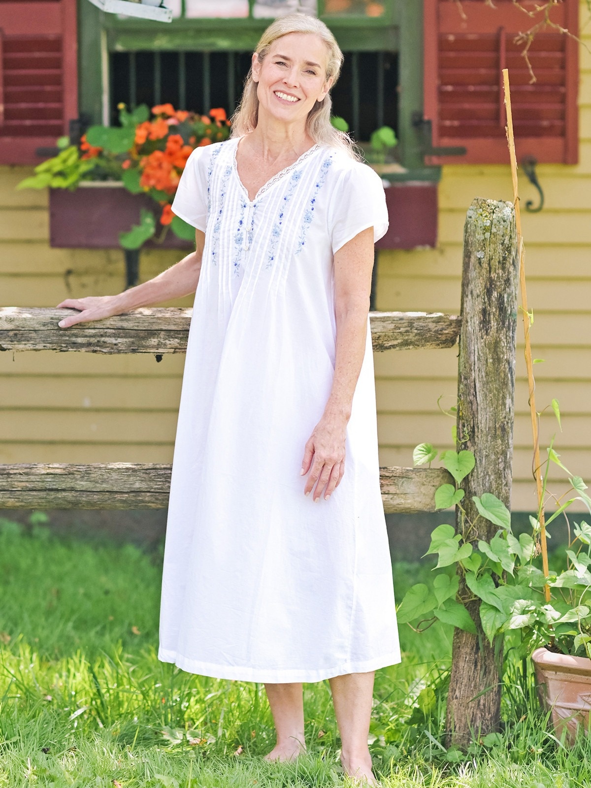 A soft cotton nighty adorned with blue floral embroidery, crochet trim, pintuck pleats, and side seam pockets for dreamy, effortless comfort. Slightly sheer. Machine wash on gentle cycle, hang to dry.