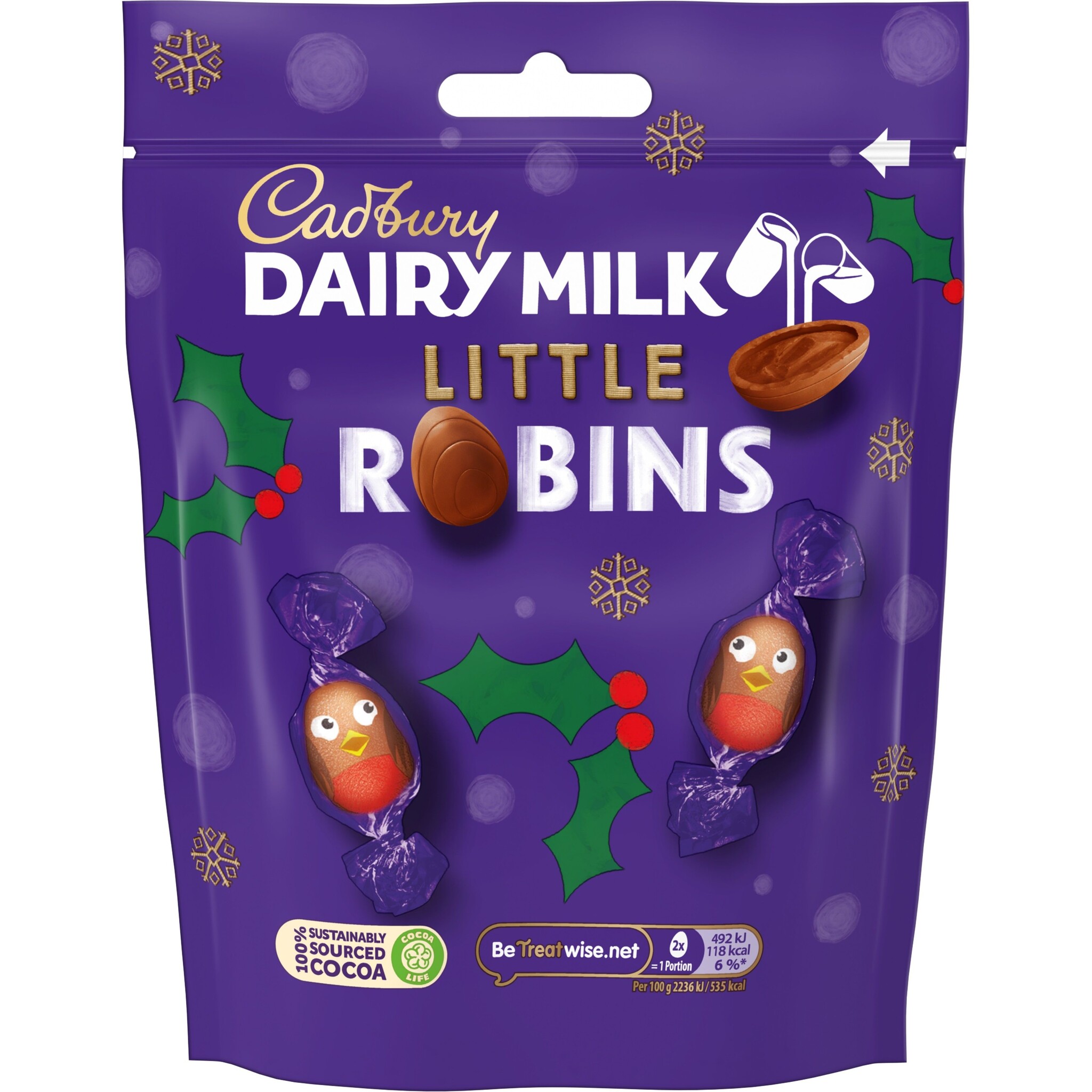 Cadbury Dairy Milk Little Robins 77g $5.69 Excl. taxAdd to cartLogin for wishlistDescriptionIndividually wrapped Cadbury Dairy Milk Robins. 77g