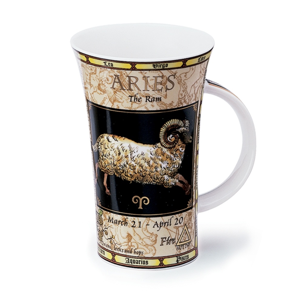 Aries, the Ram, describes specific traits that a person born under the Aries star sign may exhibit. The Dunoon 'Zodiacs' collection by Jack Dadd includes 12 wonderfully designed mugs, colored and embellished with 22-carat gold, describing the sign's astrology, dates, and meanings.
