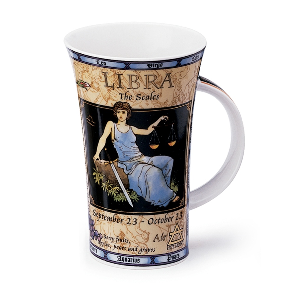 Libra, the Scales, describes specific traits that a person born under the Libran star sign may exhibit. 'Zodiacs' is a collection by Jack Dadd featuring 12 wonderfully designed mugs, colored and embellished with 22-carat gold, which describe the signs' astrology, dates, and meanings.
