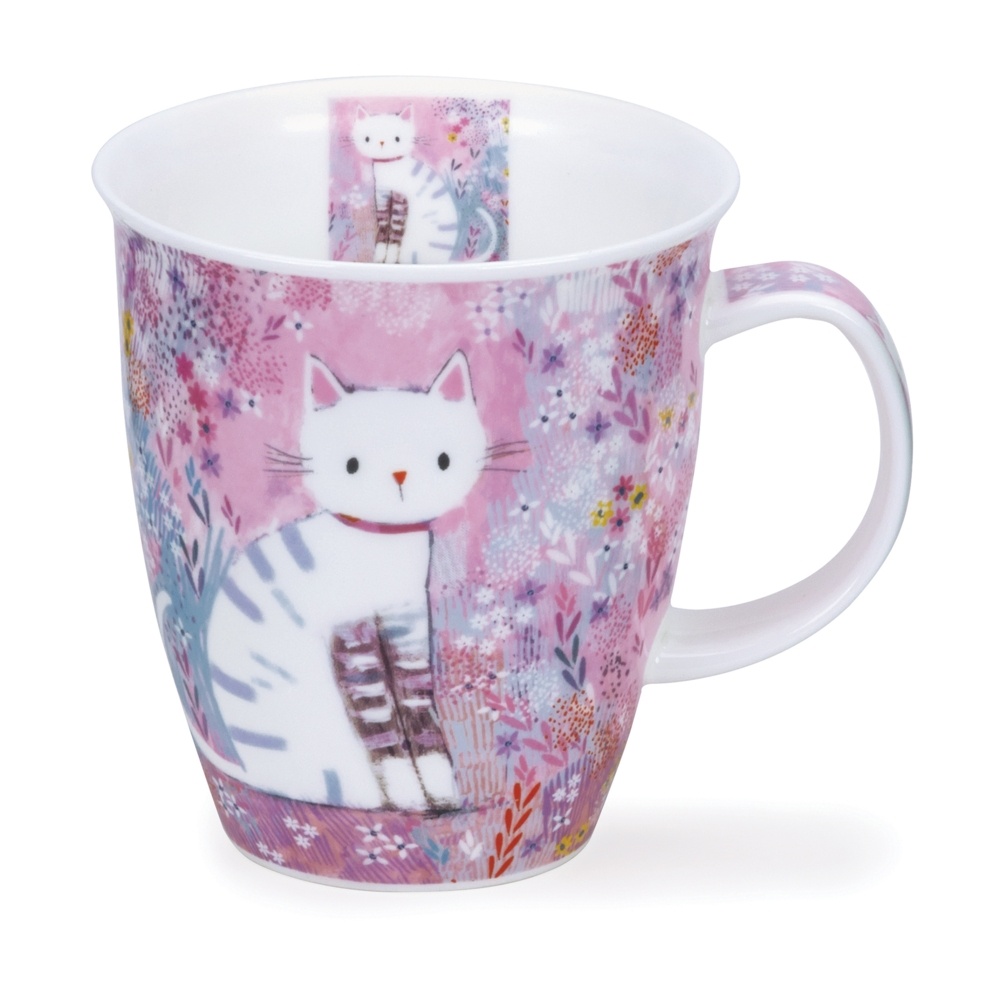 An illustrative, textured design, Claire Tupper's 'Tiddles' sits amidst a hazy array of flowers and grasses in predominantly pinks and purples, with a mass of clever details surrounding this Dunoon mug.