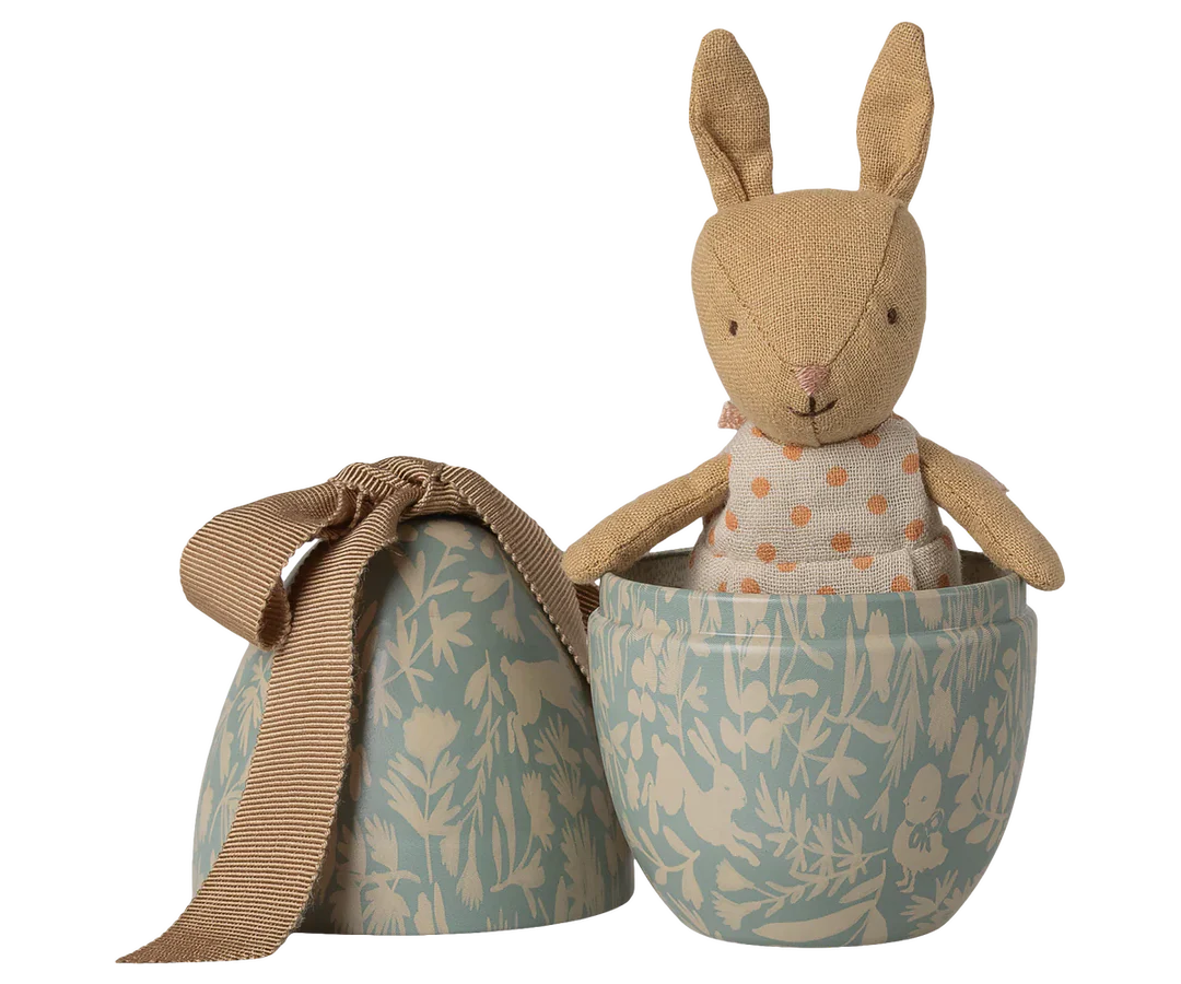 Inside this metal egg, printed with a beautiful blue print and a big soft bow on top, you will find a small rabbit dressed in a dotted suit. A perfect gift for the small ones. The rabbit has magnets in hands so it can hold around the egg.