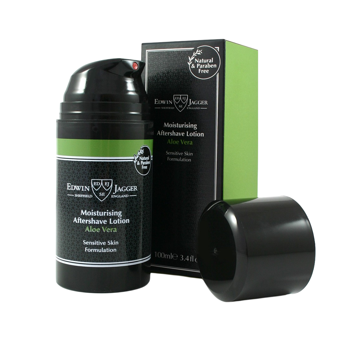 Edwin Jagger Aloe Vera Aftershave Lotion is designed for sensitive skin. It features a soothing blend of aloe vera, plant extracts, and essential oils that moisturize, repair, and reduce razor burn without a greasy residue. The lotion has a light, subtle fragrance. Made in England.