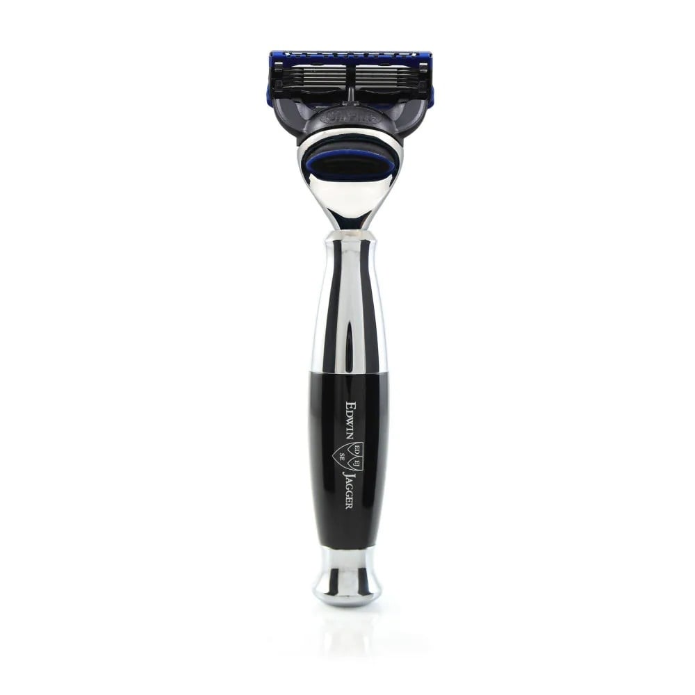 This smart, contemporary razor is fitted with a Gillette Fusion head. A satisfying weight, the black handle is finished with a bright chrome-plated collar and end cap. Gillette Fusion ProGlide 5-blade system with lubricated protection strips will produce an ultra-close, safe shave.