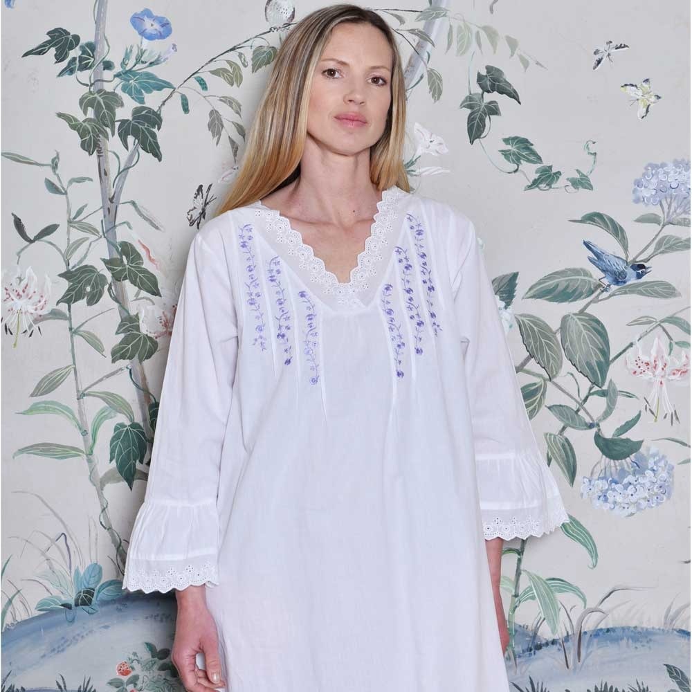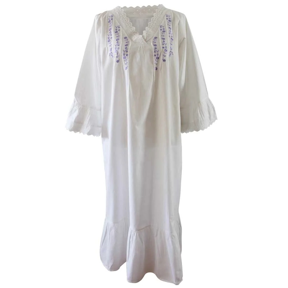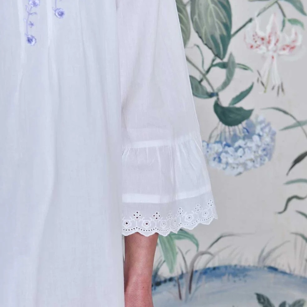 This beautiful white cotton nightdress could double up as a summer or beach dress. The v-neckline and wide flounced cuff sleeves are trimmed with a wide broderie anglaise lace. Below the neckline, the nightdress is embellished with beautiful floral embroidery in lilac and rows of fine pintucks. The full-length nightdress is finished with a deep flounced hem.