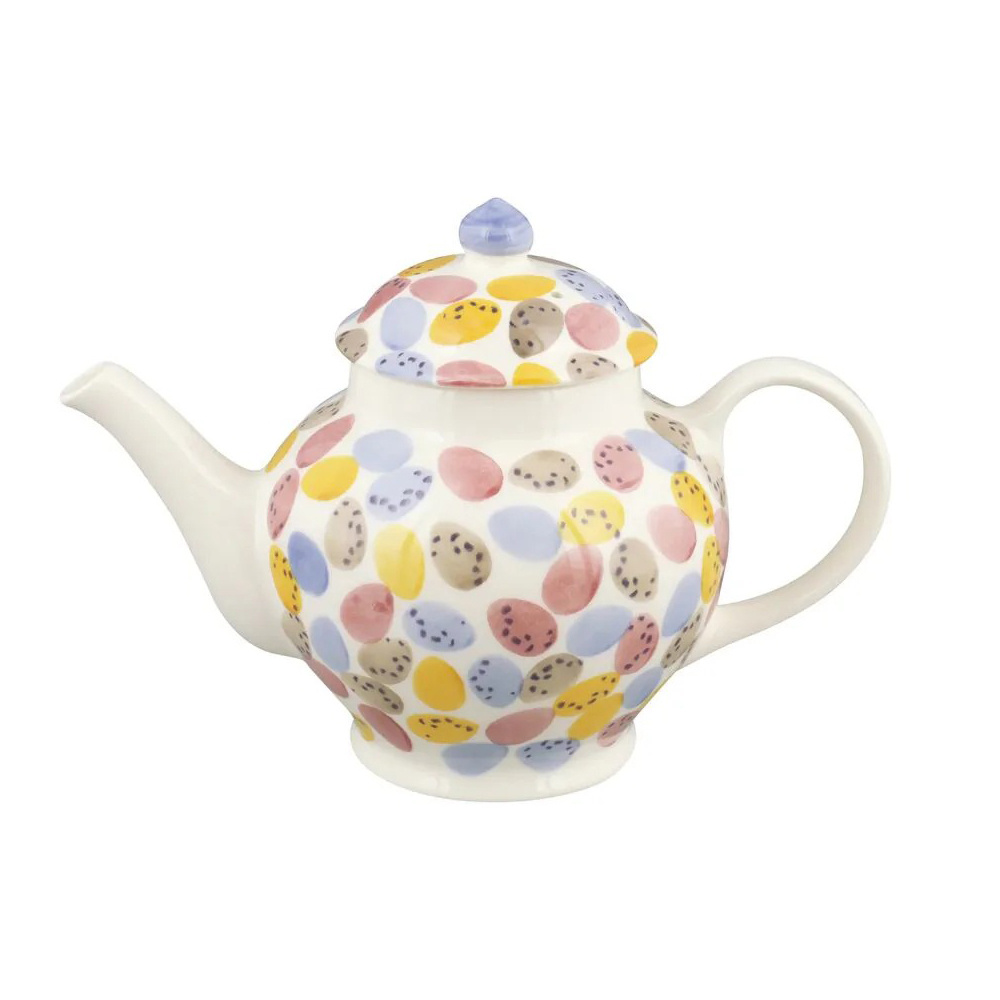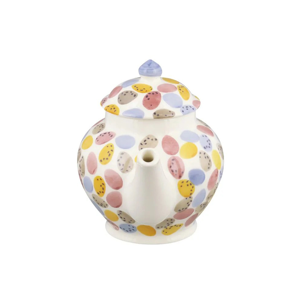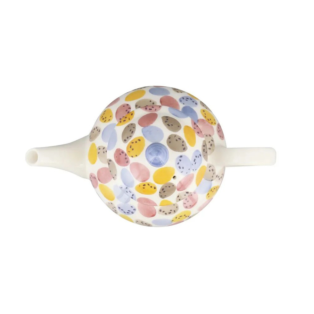 Designed for sharing "springtime brews," it features a cream-colored background adorned with a colorful, hand-painted sponge print of speckled pastel mini eggs in shades of pink, blue, yellow, and grey, and holds approximately two mugs, making it ideal for smaller servings.