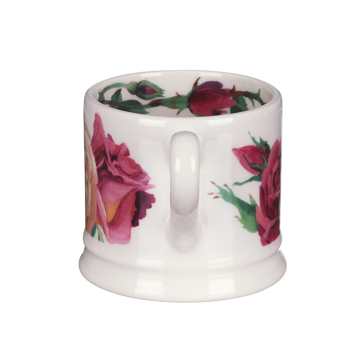 The gorgeous rose flower, in all its stunning glory, is depicted on this small mug by Emma Bridgewater. These large, beautiful pink-and-cream flowers are depicted in full bloom around the body of this little mug, with lush green leaves poking out between them. On the inside rim of this mug is a rose stem twisted around the rim, complete with its thorns and buds.