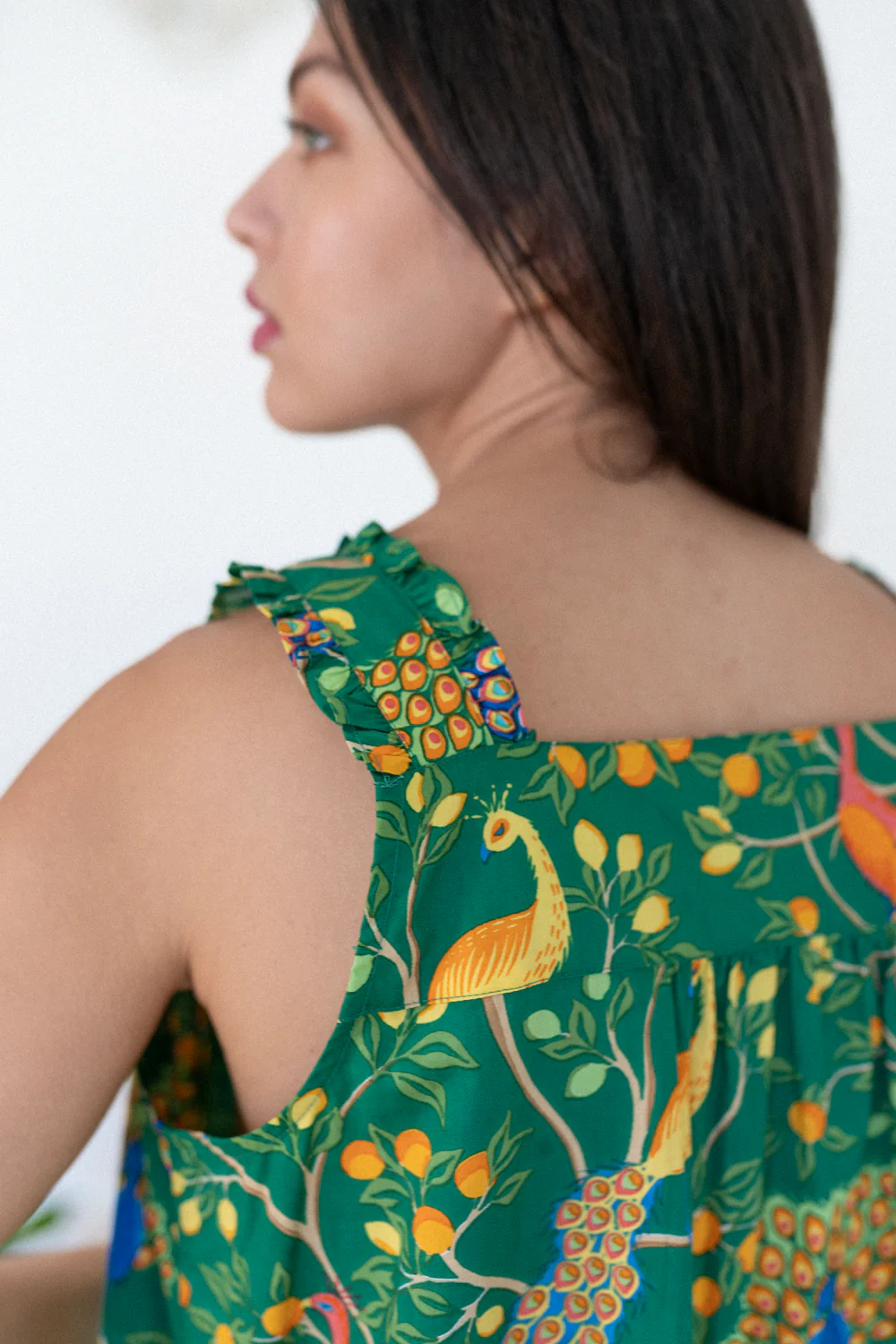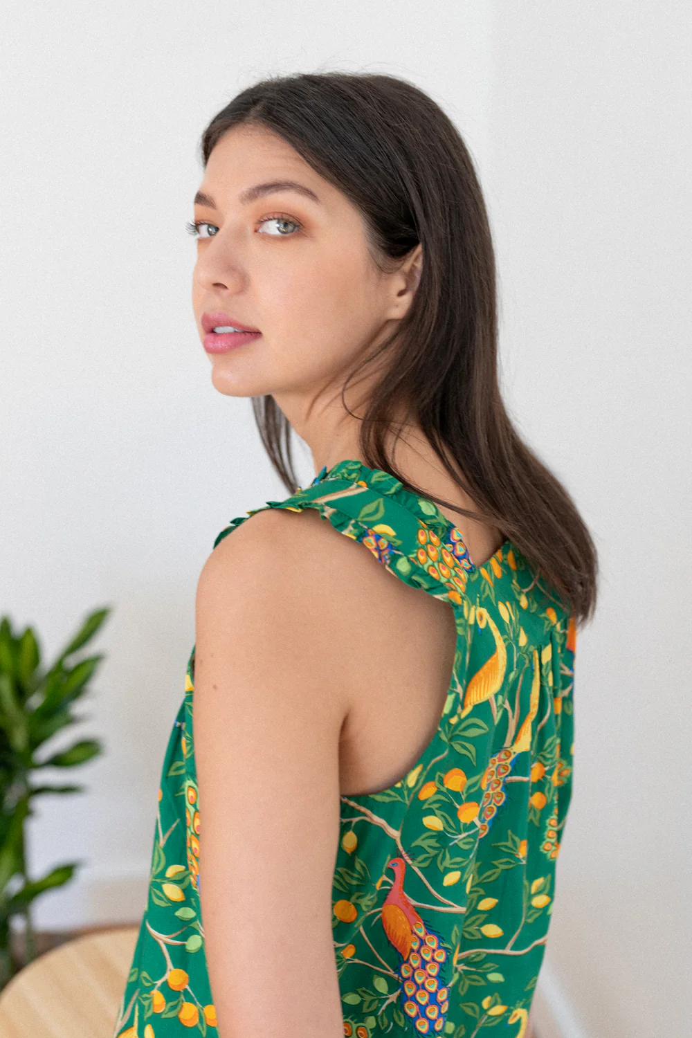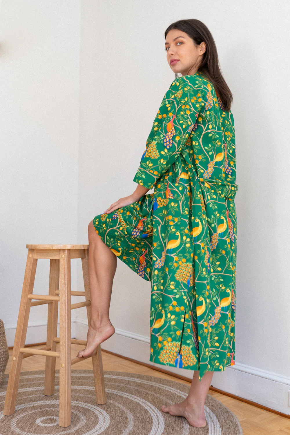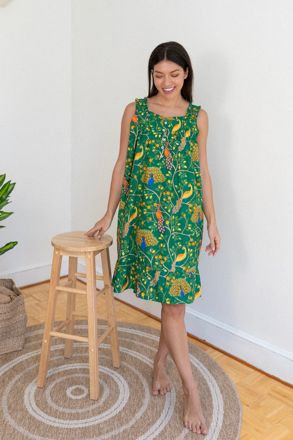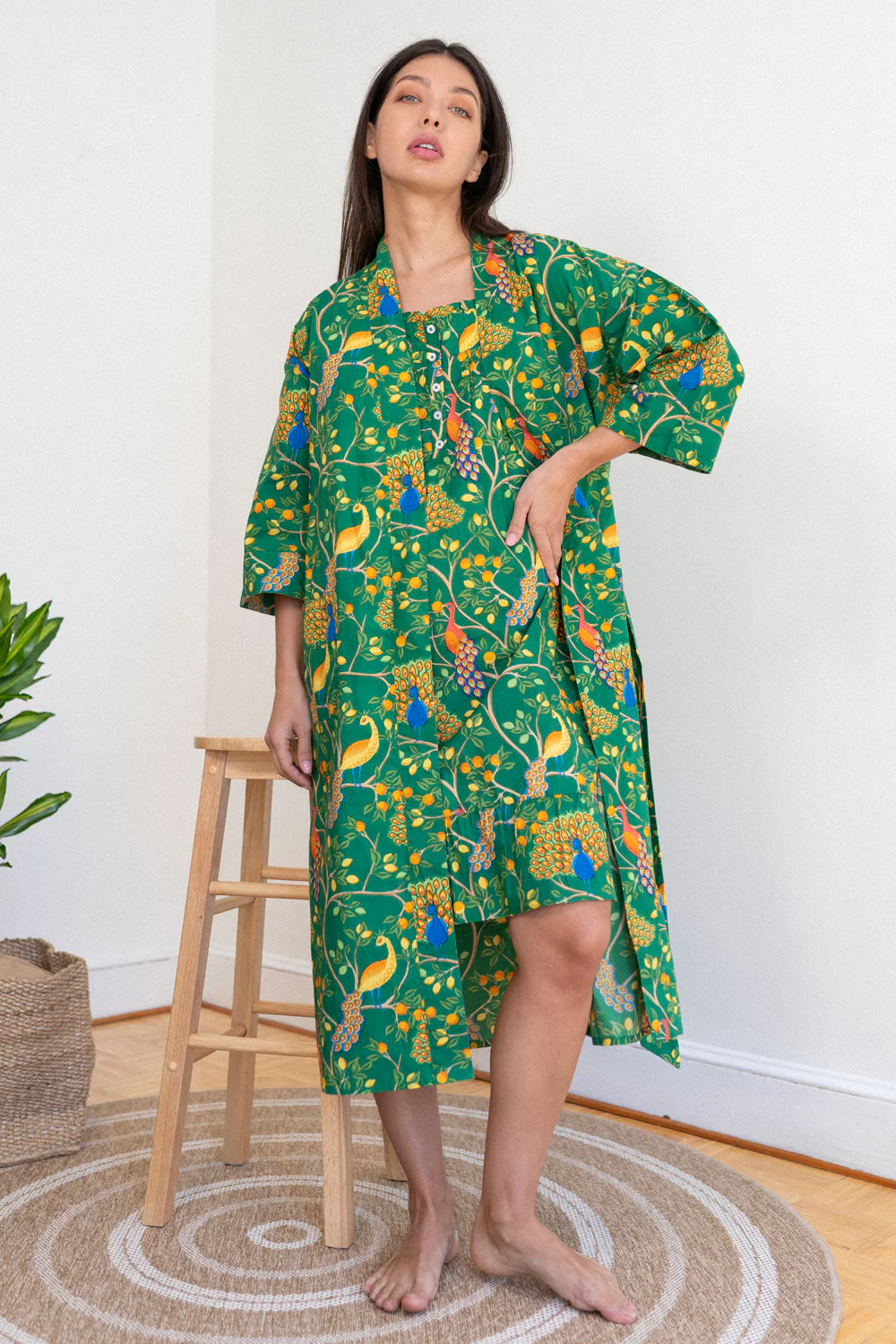 Made of 100% organic cotton poplin, this green nighty features a unique, hand-screen-printed design, functional embossed synthetic buttons, and deep inseam pockets. It comes inside a matching fabric pouch, includes matching hair scrunchie. Midi length.