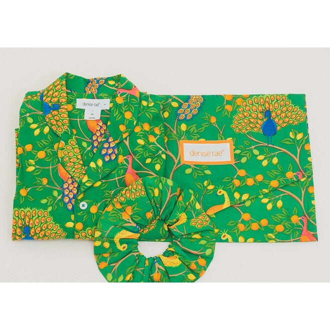 Light as a feather and soft as a dream, this green short sleep set is designed to help you enjoy the comfiest sleep of your life, all year round. It features a unique, hand-screen-printed design. The top features a notch collar, functional pocket, embossed synthetic buttons and contrast inside the back panel. The shorts feature an elastic waistband with self-drawstring and side pockets. It comes inside a matching fabric pouch, with matching hair scrunchie.