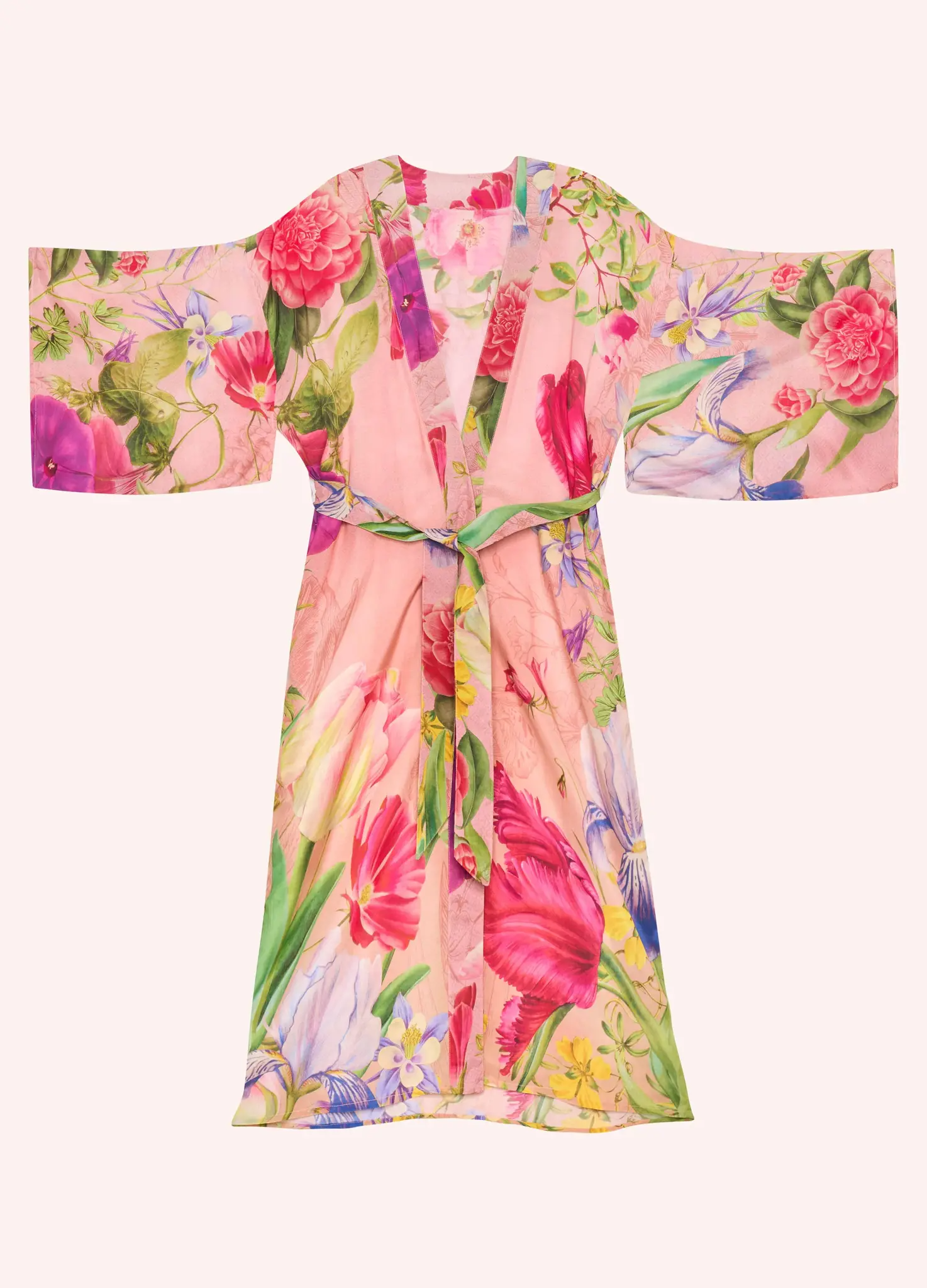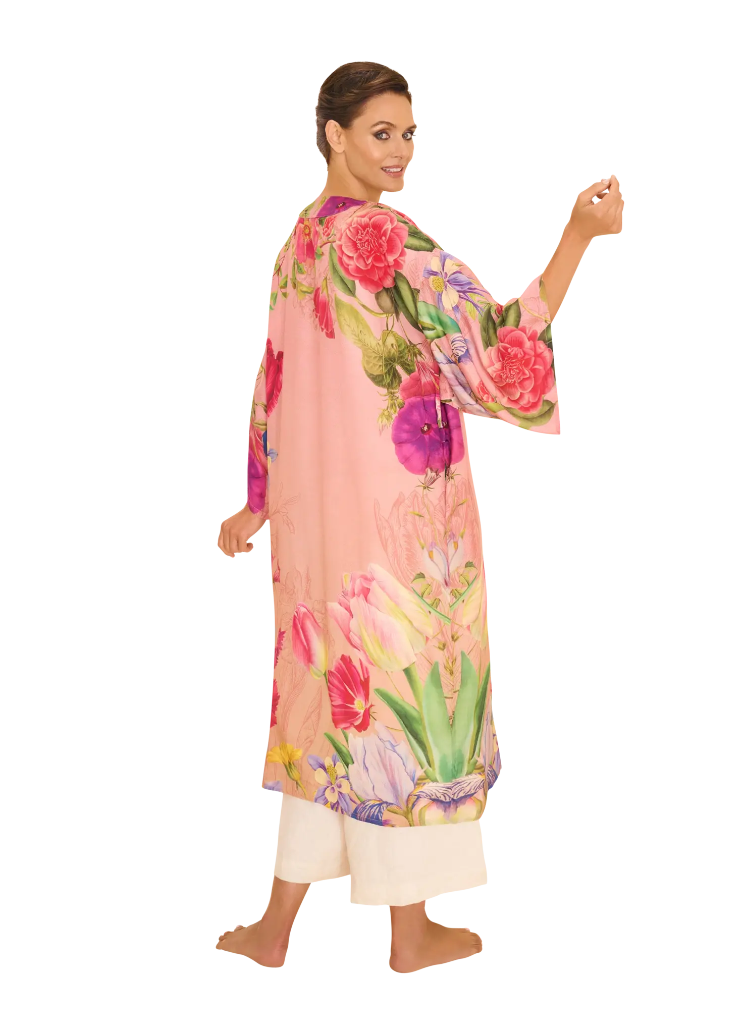 Timeless femininity exudes from this floral study kimono gown in pink. Pair with your favorite floaty midi skirt and top for an elevated everyday look, day-to-night. Not just a look, a vibe!